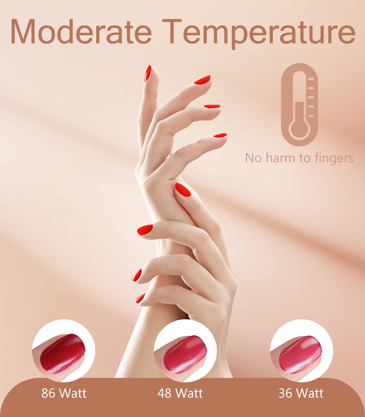 - Moderate Power: After repeated tests, our Easkep 86W nail lamp current beads have the most suitable quantity and distribution. Compared with low-power such as a 48W nail lamp, the drying speed is twice as fast. But it won't overheat and hurt your fingers like other high-power nail lamps.