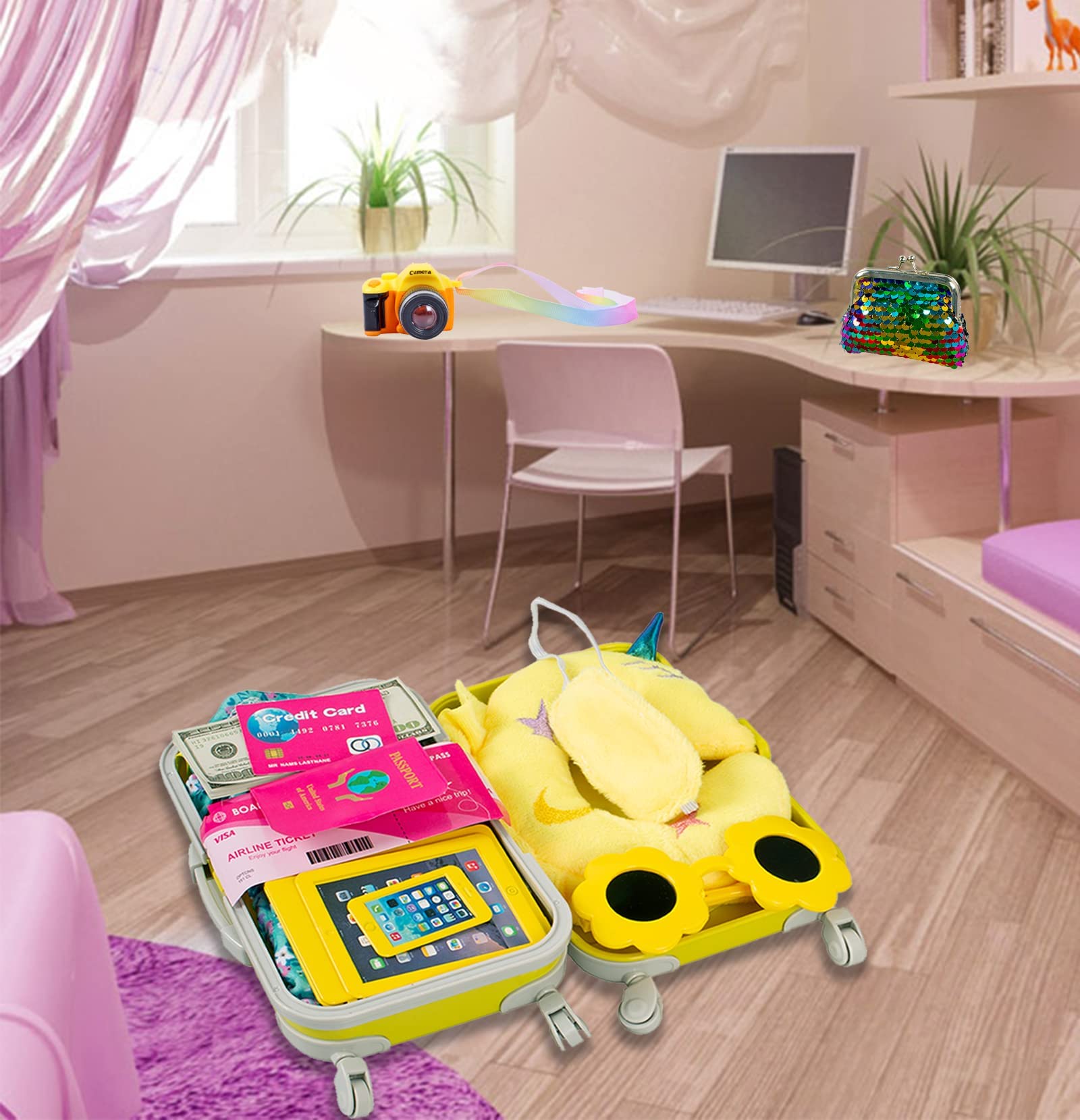 - PERFECT TRAVEL SETThis is a girl doll clothes and accessories travel set.your kids can dressed her favorite doll in this trendy yellow outfit with luggage-adorable sunglasses and shiny handbag adds the finishing touch.Get ready to visit places taking a lot of funny stuff.Such as camera,tablet,cell phone,passport,credit card and ticket.And don't forget lying down with the patch and U-shaped pillow when you on the flight.