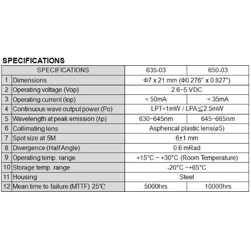 - Wave length: 650nm. Output power: Class IIIa – less than 5mW. 2.6~5 VDC operation. Beam Divergence (Half Angle) : 0.6 mRad. Beam shape: oval, not perfect circular. Dimensions: D7 x 21 mm.