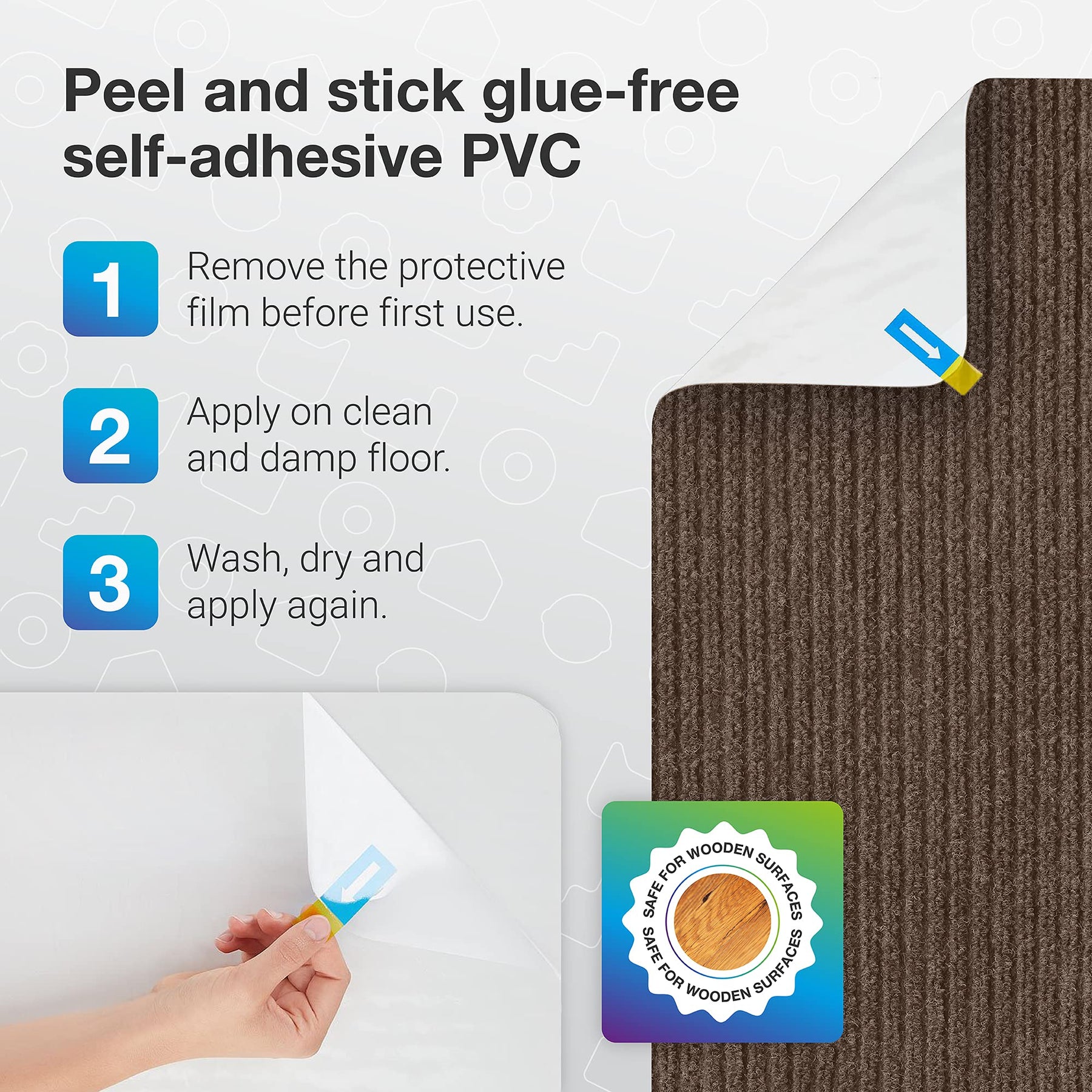 - [Safety First] - These indoor nonslip carpet treads protect your pets, kids, elders from unwanted falls. Our tread strips are designed with “anti-moving” backing to keep the carpet in place. NOTE that the anti-moving surface is NOT adhesive like glue or permanent tape. We offer peel and stick glue free self-adhesive PVC to ensure that your wooden stairs remain both secure and undamaged. When handling the adhesive, you won't feel any stickiness on your hands.