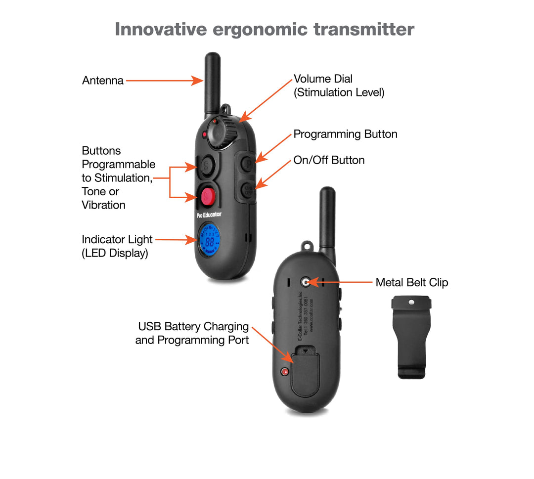 | included components | Waterproof ergonomic transmitter with lanyard and belt clip, 3/4 x 30 biothane collar with receiver, 5/8 and 3/4 contact points, Contact point removal tool, Battery charger |