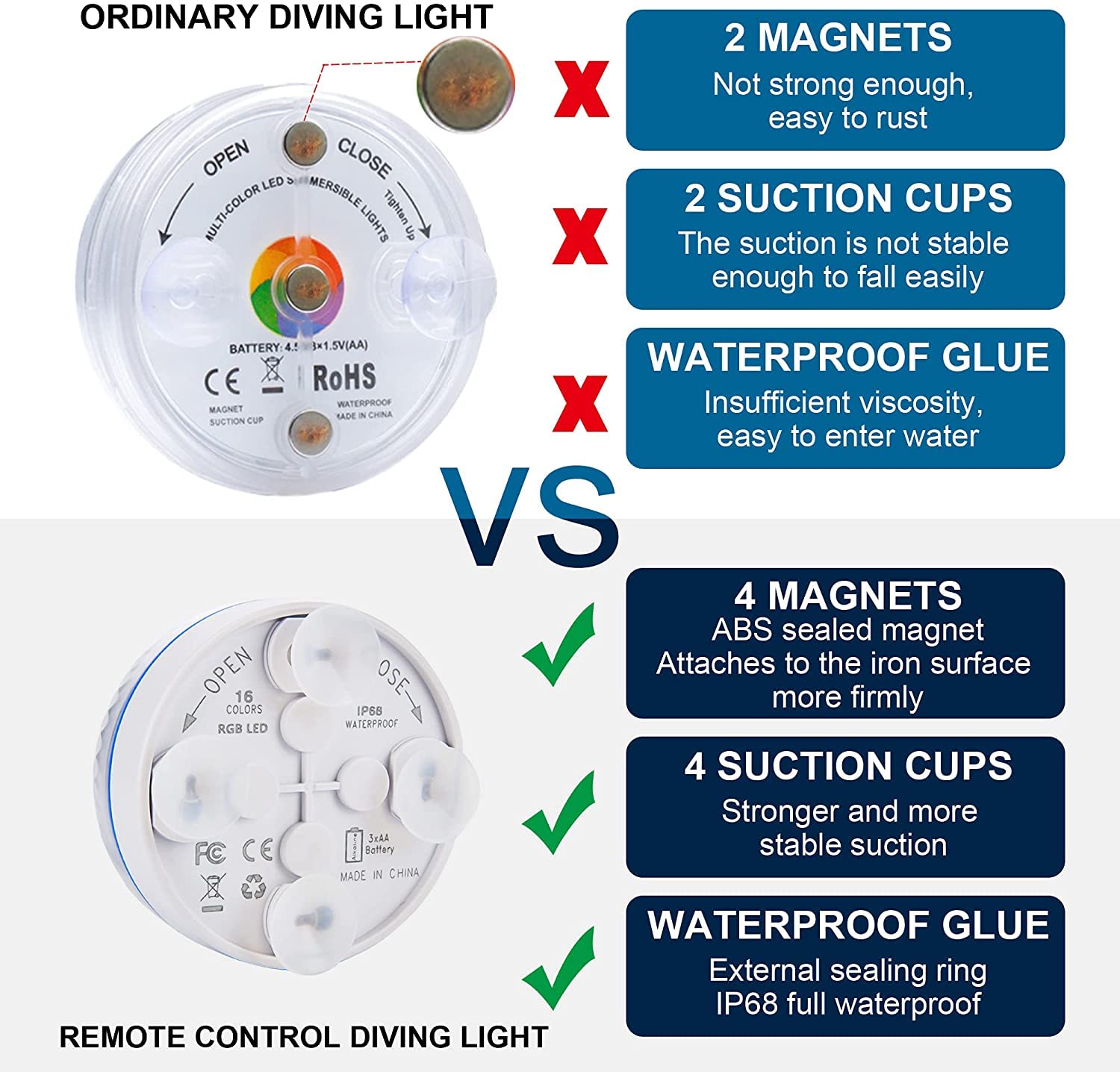 Enhanced Leakproof Rustproof Design: All magnets won't get rust since they are all sealed perfectly in the led submersible lights.