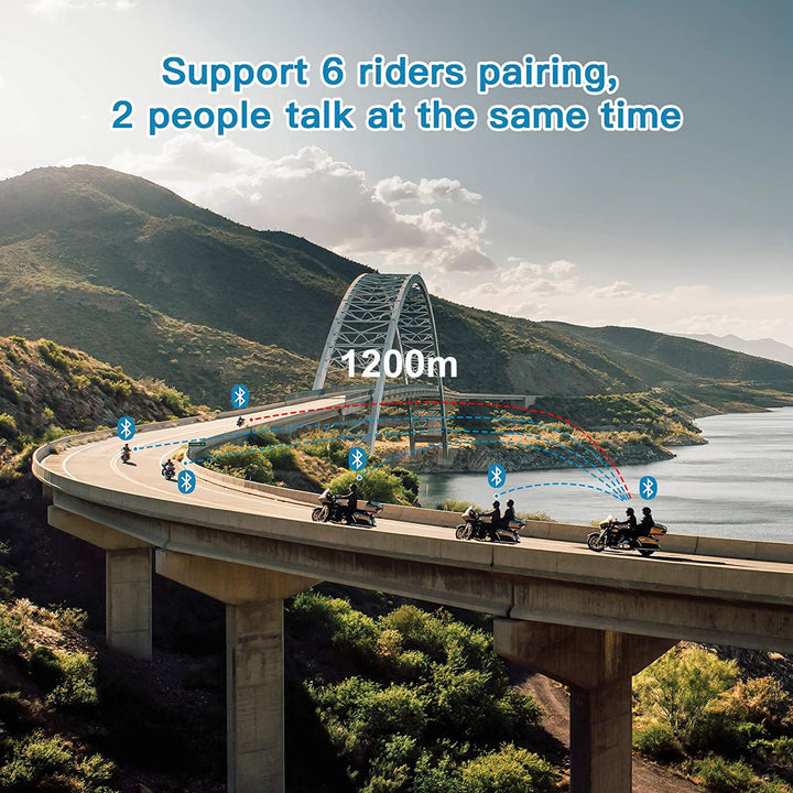 - [2-Rider Intercom System] EJEAS V6 Pro motorcycle bluetooth headset supports pairing of 6 people but only 2 riders can talk to each other (the host can choose any one of the 5 people). The distance can reach 1200M between 2 people, within the effective distance, the sound is clear and stable, and V6 Pro motorcycle intercom can communicate well with partner.
