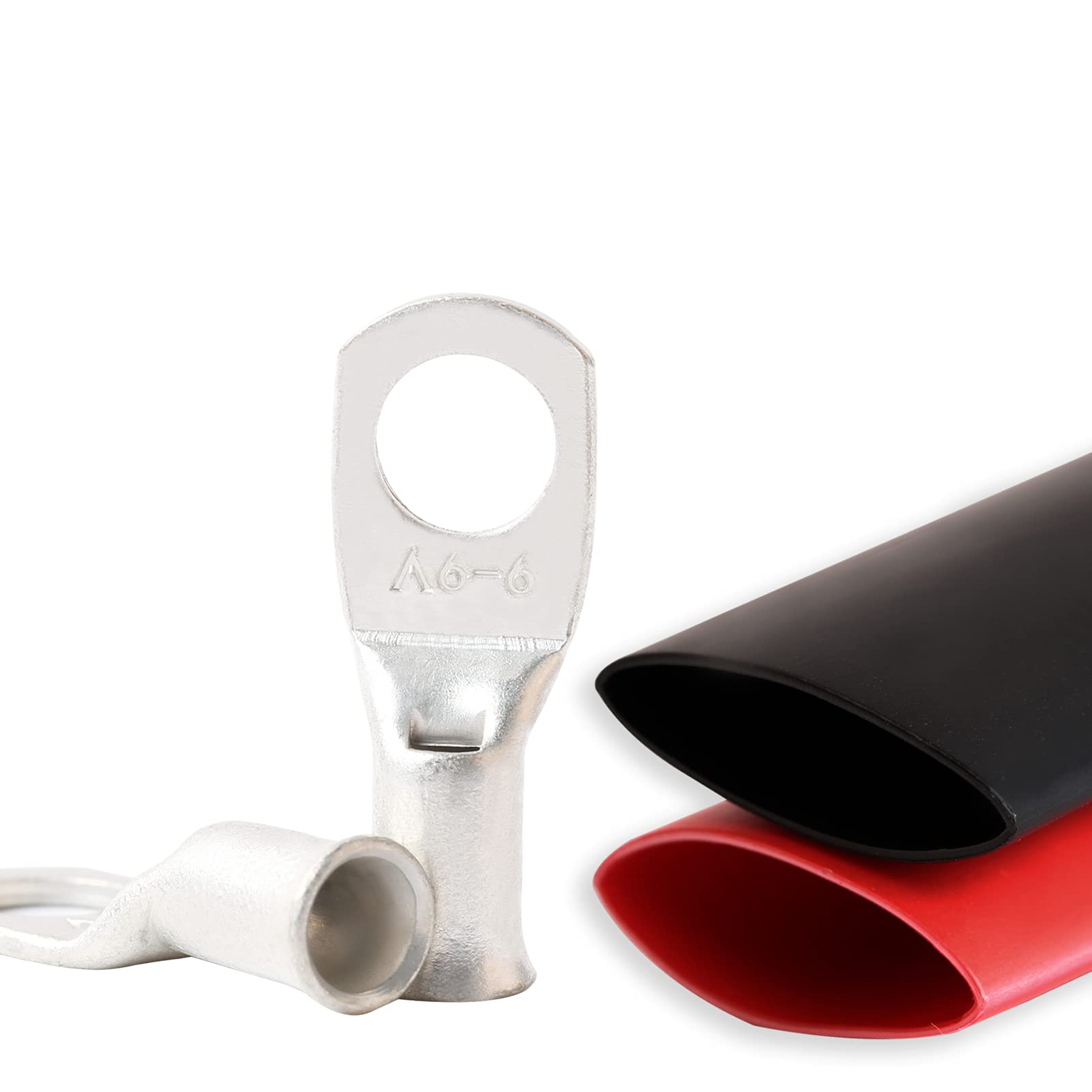 - Value Package: 20pcs 12-10 Guage 1/4 Stud(M6) battery cable lugs, tinned copper wire lugs closed-end ring terminal, 20pcs 3:1 dual wall adhesive heat shrink tubings for your work (10pcs Black + 10pcs Red)