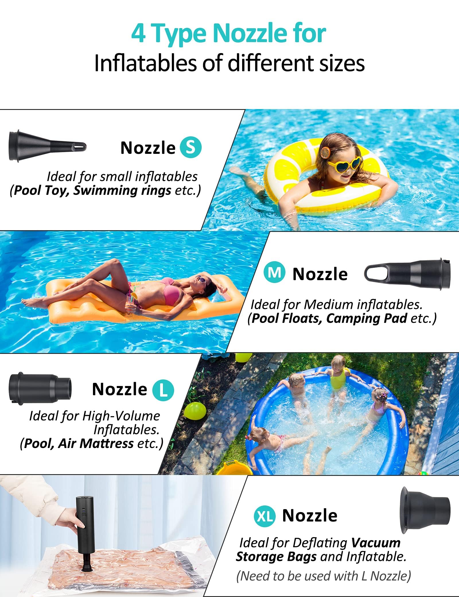 - 4 Type Nozzle for Various InflatablesThis electric pump for inflatables comes with 4 sizes of nozzles, perfect for Inflatable pool/floats/toys/boat/raft, Air mattress/bed/sofa, Yoga Ball, and Vaccum Storage Bag for clothes. (IMPORTANT NOTE: Cannot use for balloons, basketball, tires.)