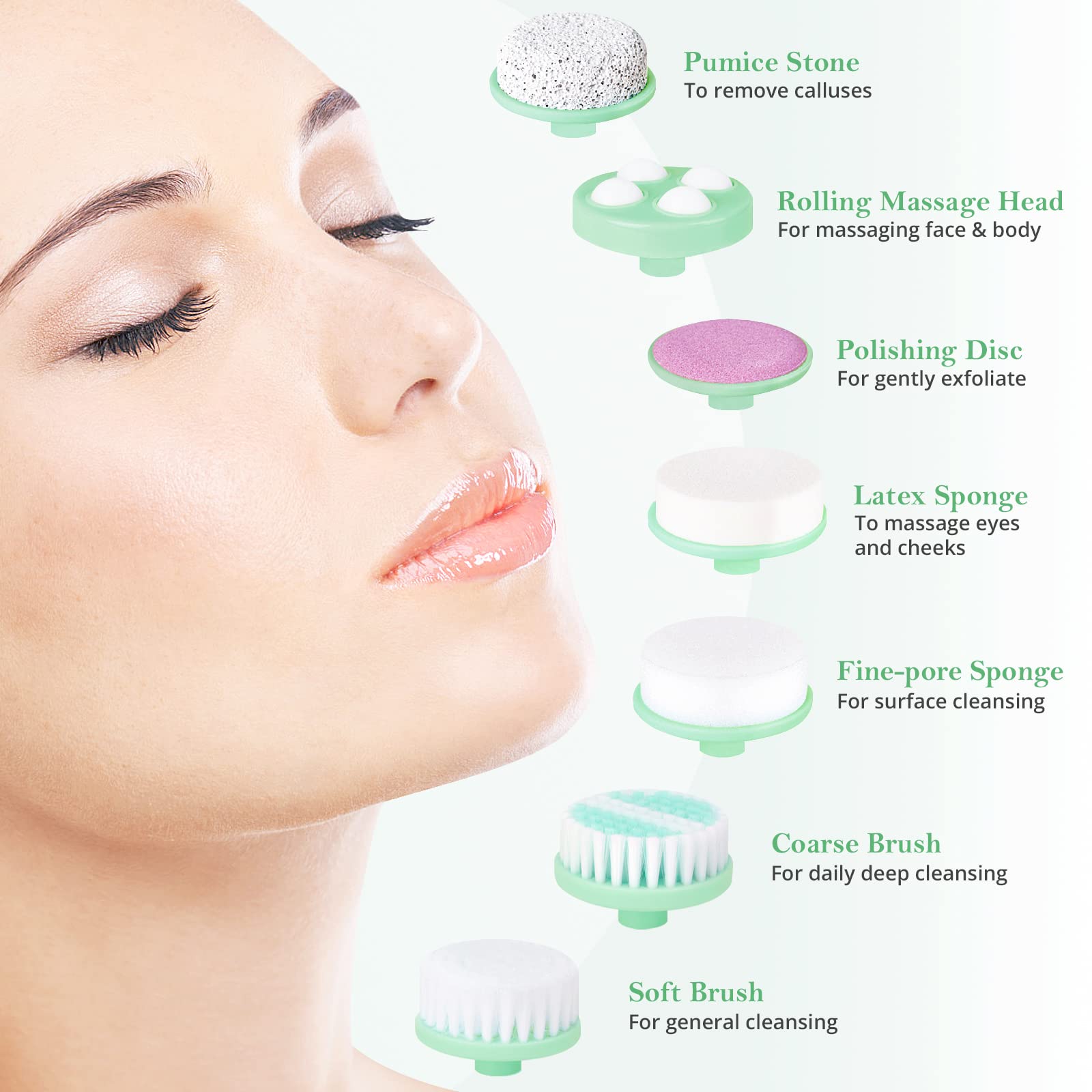 - 7 DIFFERENT BRUSH HEADS - Including two facial cleaning brushes, two sponge heads, one pumice head, one polishing head and one massage head for deep cleansing, gentle exfoliating, blackhead removing, makeupdead skin removing and face massaging. Suitable for all type skin: sensitive, oily, dry, combination