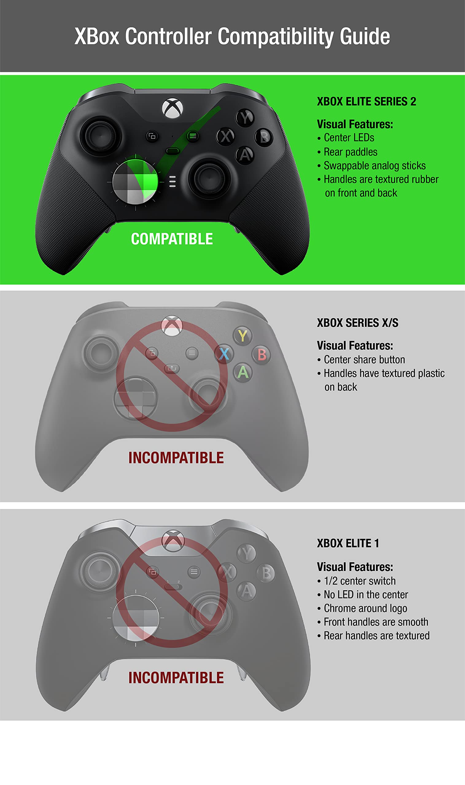 - MADE FOR XBOX ONE ELITE SERIES 2 CONTROLLER (2019): Designed in the U.S.A. specifically for the ELITE series 2 controller (NOT DESIGNED FOR SERIES 1) with full unobstructed access to all buttons, paddles, charging docks and stereo headset ports (PLEASE NOTE: Controller is not included, Each purchase is for a single skin and 8 thumb grips)