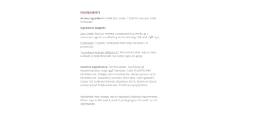 | ingredients | Zinc Oxide Tocopheryl acetate Octinoxate Bees Wax, Butylene Glycol, Cetyl Dimethicone, Cetyl PEG/PPG-10/1 Dimethicone, Disodium EDTA, Hexyl Laurate, Hydrogenated Castor Oil, Iodopropynyl Butylcarbamate, Isopropyl Palmitate, Octyldodecyl Neopentanoate, Polyglyceryl-4 Isostearate, Purified Water, Sodium Chloride, Tocopheryl Acetate, Triethoxycaprylylsilane. |