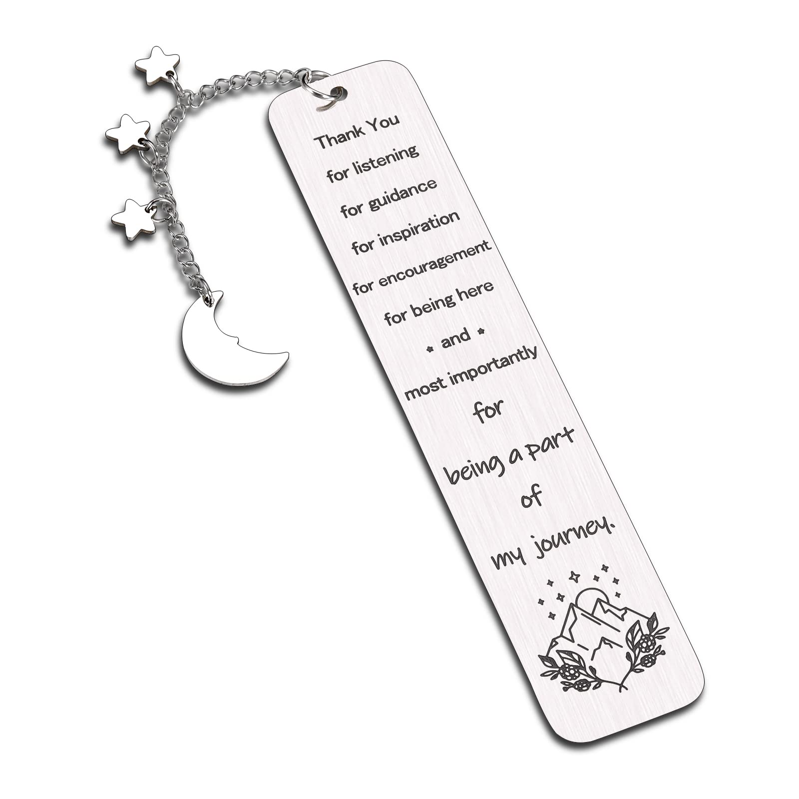 - Thank You Gifts For Teacher - Appreciation bookmark engraved with words “Thank You for listening for guidance for inspiration for encouragement for being here And most importantly for being a part of my journey.” When graduating and leaving school, don’t forget to thank the teachers who trained you carefully and send them this bookmark with chains of stars and moons. Teachers mentors can feel your gratitude to them when they are reading.