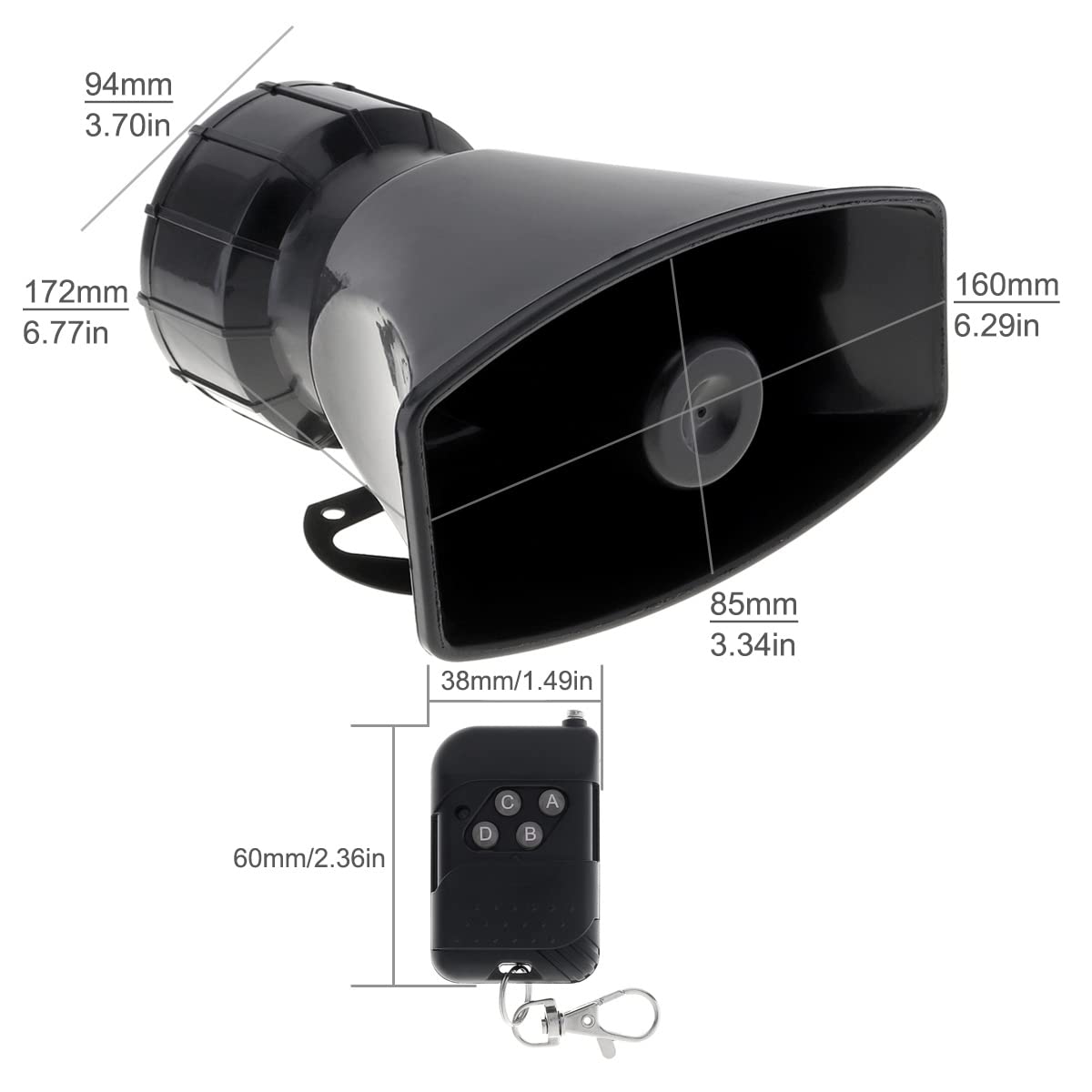 - WIRELESS REMOTE CONTROLLER: Easy to operate, control the horn with the button. Button A: Tone 1;Button B: Tone 2, press to stop the siren;Button C: Tone 3;Button D: 4 Different Tones, press to change tone.