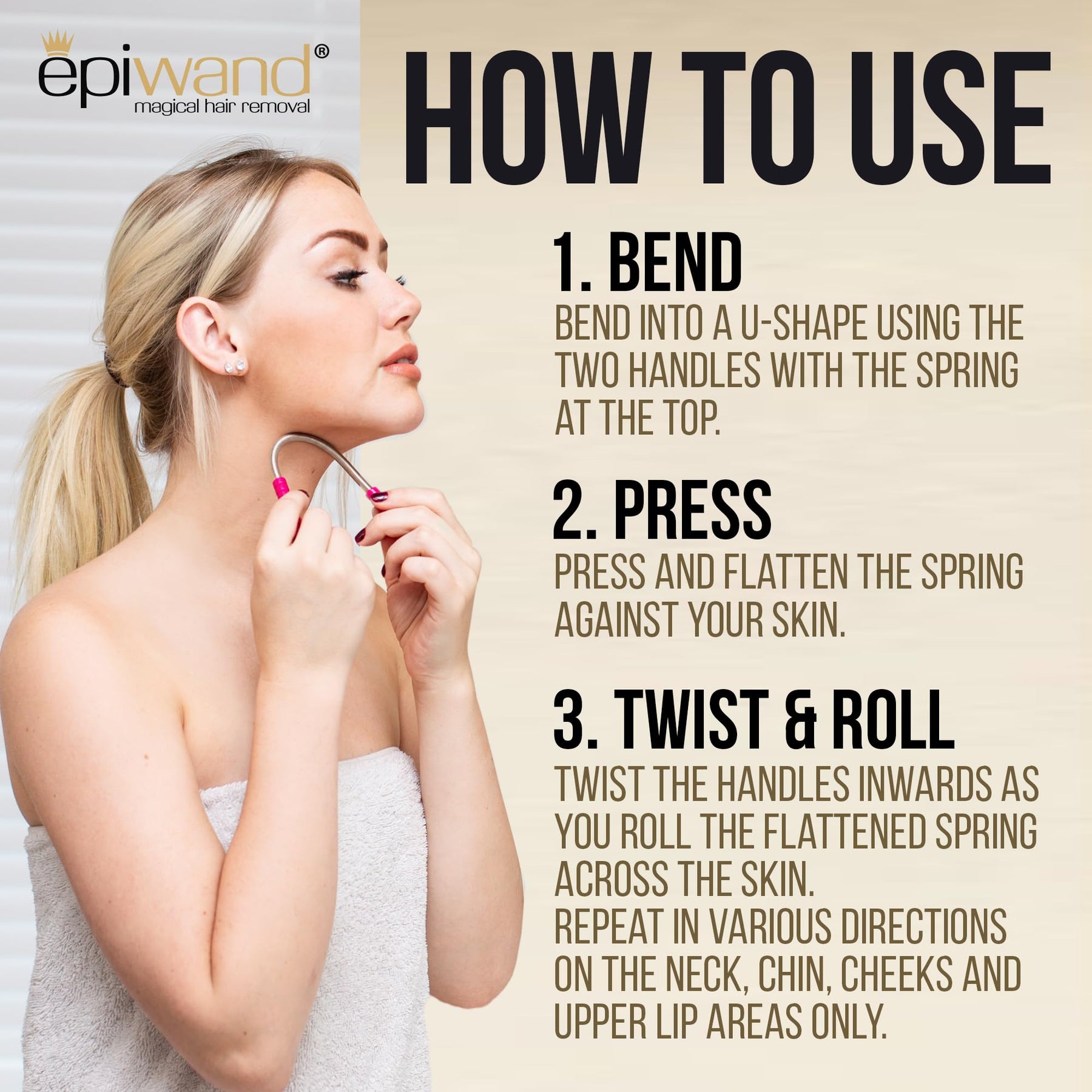 directions | Bend, Press, Twist, Roll Technique. Step 1 - Bend Using both hands, bend your Epiwand into a U shape with the spring at the top. Step 2 - Press Press the spring firmly against your face, so that the spring flattens against the skin. Step 3 - Twist and Roll Using your index fingers and thumbs, twist the handles so that the spring rolls across your face. Step 4 - Top Tip Make sure that the spring rolls 2-4 inches, and apply enough pressure so that the spring remains flat as it rolls. |