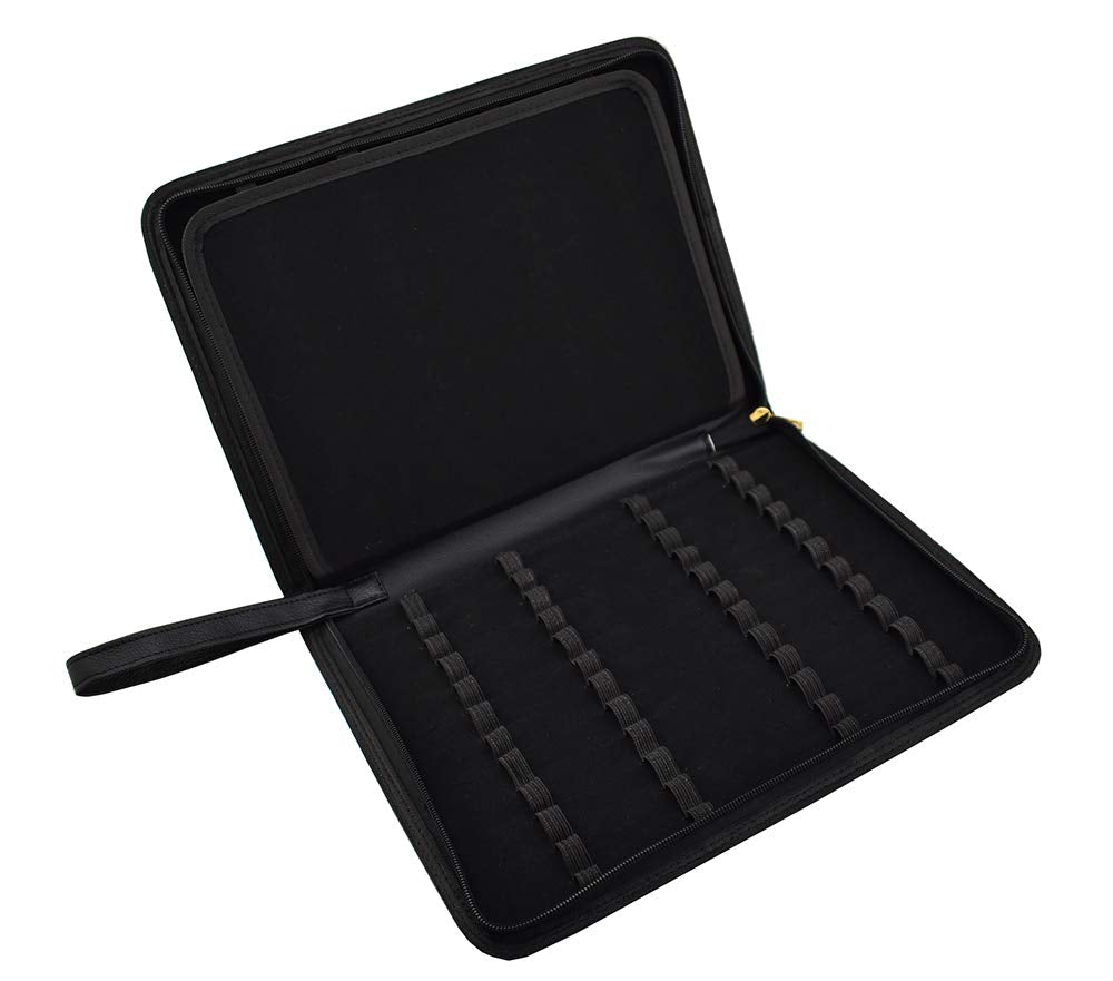 - Large Capacity--Two-layer design with 48 straps on each side which can insert 24 pens in each side.Tensile Rubber straps hold pens securely.