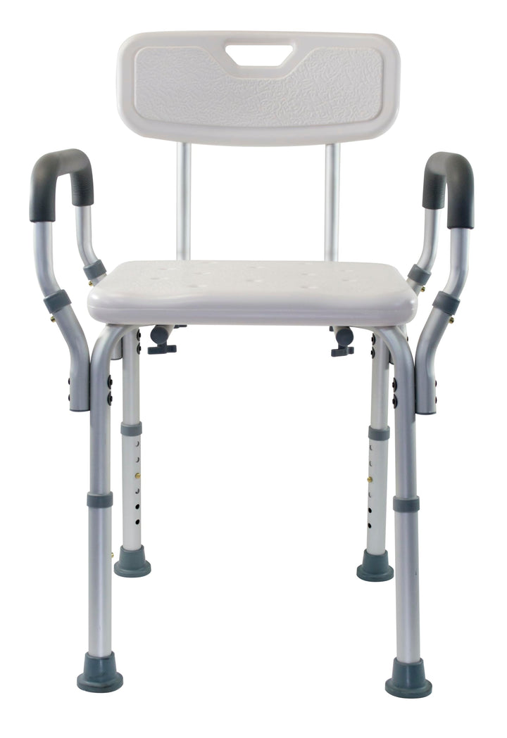 - EASY ASSEMBLY: Don’t worry about tools or frustration with the Shower Bench with Arms, this one is tool free! Features an easy to assemble frame with clear step by step instructions and easy to grip knobs.