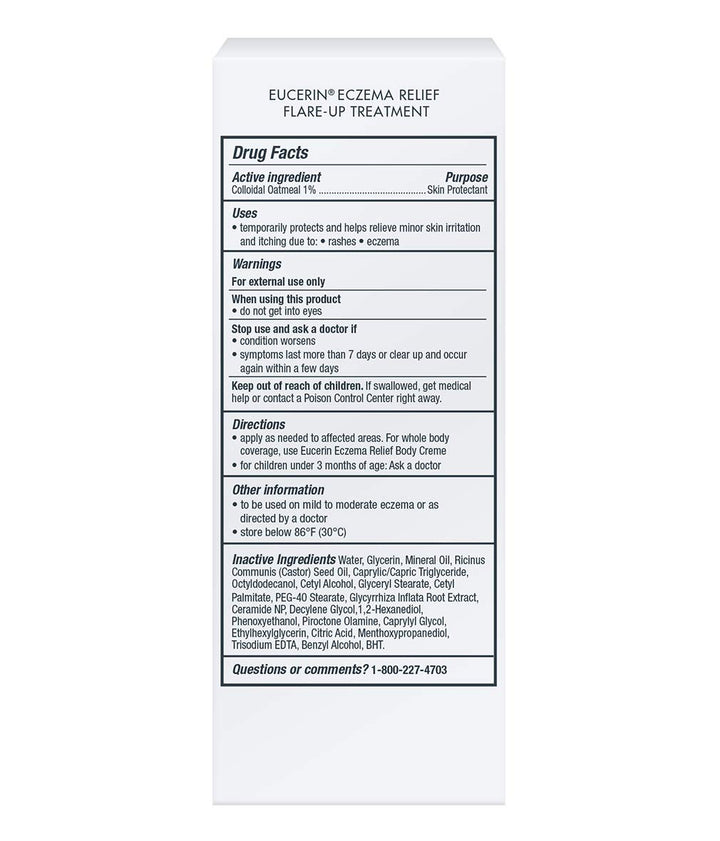 - Colloidal Oatmeal, Ceramides and Licorice Root: Eucerin Eczema Cream Flare-Up Treatment is formulated with Colloidal Oatmeal (a skin protectant), Ceramide-3 and Licorice Root Extract