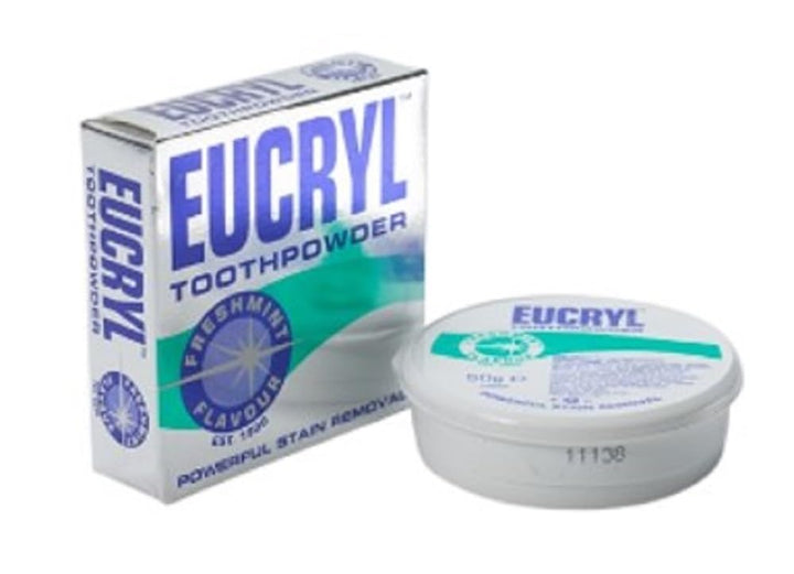 | directions | Wet toothbrush and shake off surplus water. Press into powder. Brush your teeth in the way your dentist recommends. For powerful stain removal it's only necessary to use Eucryl Tooth powder once or twice a week in addition to your usual toothpaste. Avoid use on damaged teeth. Always replace the lid and press firmly to close to preserve freshness. Not recommended for children. |