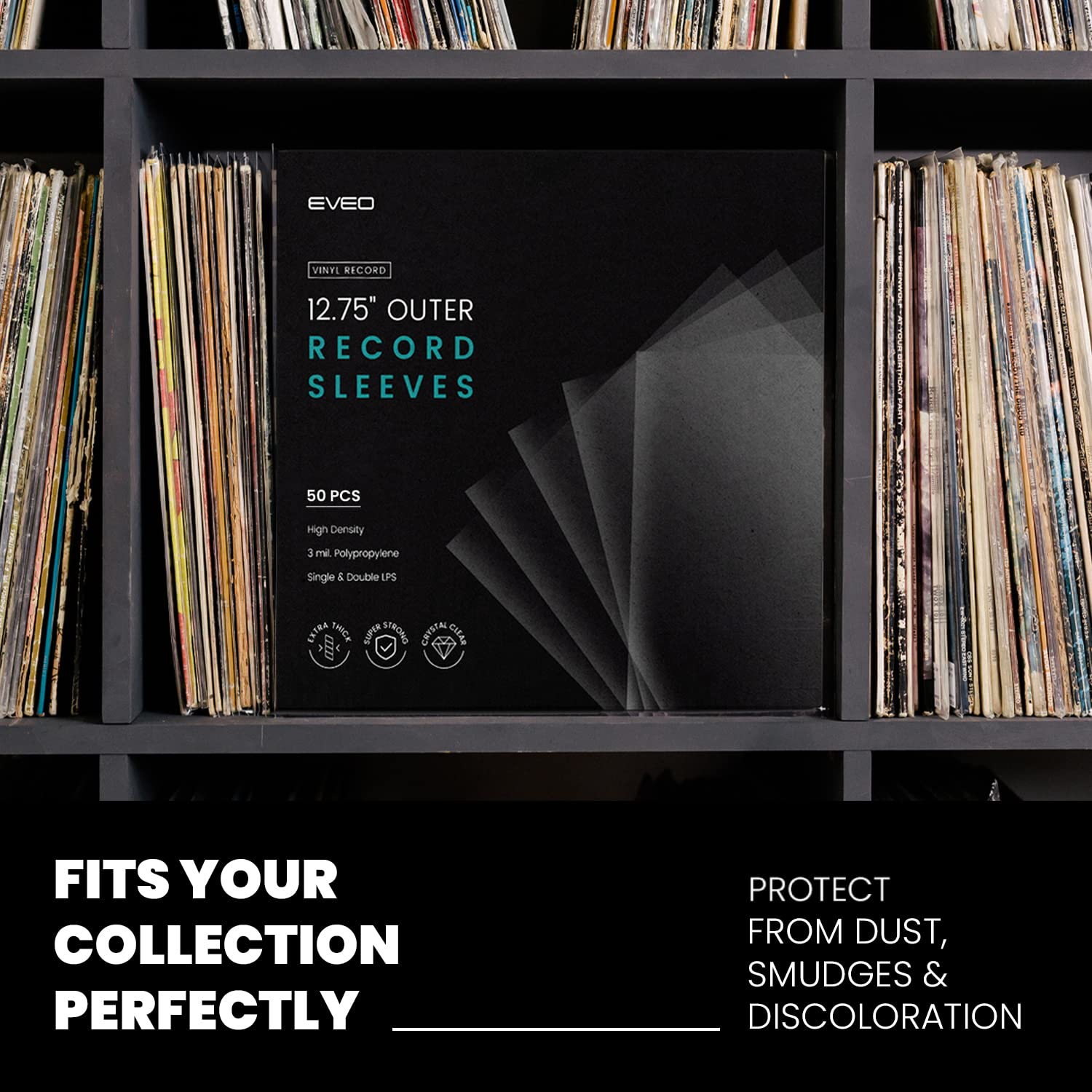 - CRYSTAL CLEAR YET EXTRA THICK: While the EVEO Vinyl Record Sleeves boast of a 3-mil thickness to ensure protection from moisture, tears & other blemishes, these premium plastic record sleeves also provide optimal transparency and clarity for your album storage & archiving convenience. Now, with our crystal clear record sleeves, you can easily store, organize, and display your precious albums without removing protection
