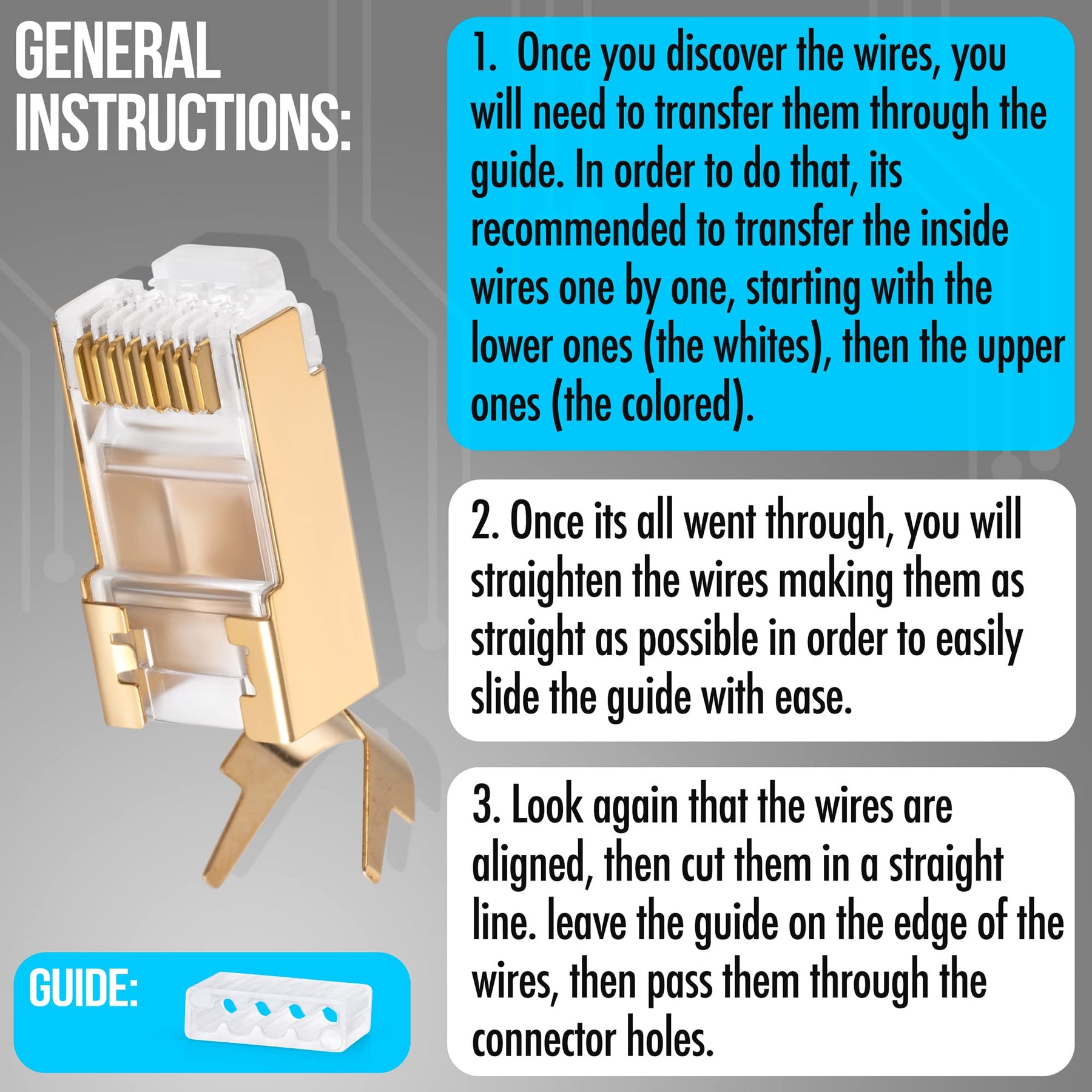 3. Look again that the wire are aligned, than cutting them in a straight line, leave the guide on the edge of the wires, then pass them through the connector holes.