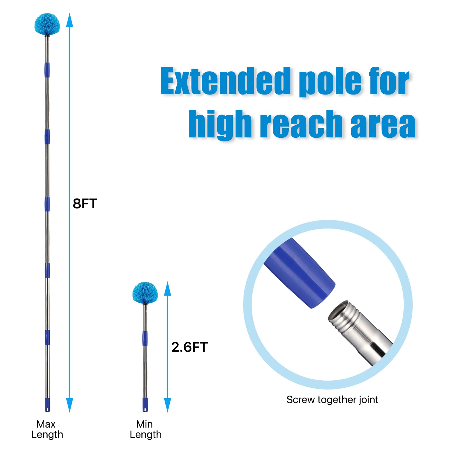 - Length Adjustable This cobweb duster consists of several sections of poles. You could adjust the length from 2.6FT to 8FT according to your needs.