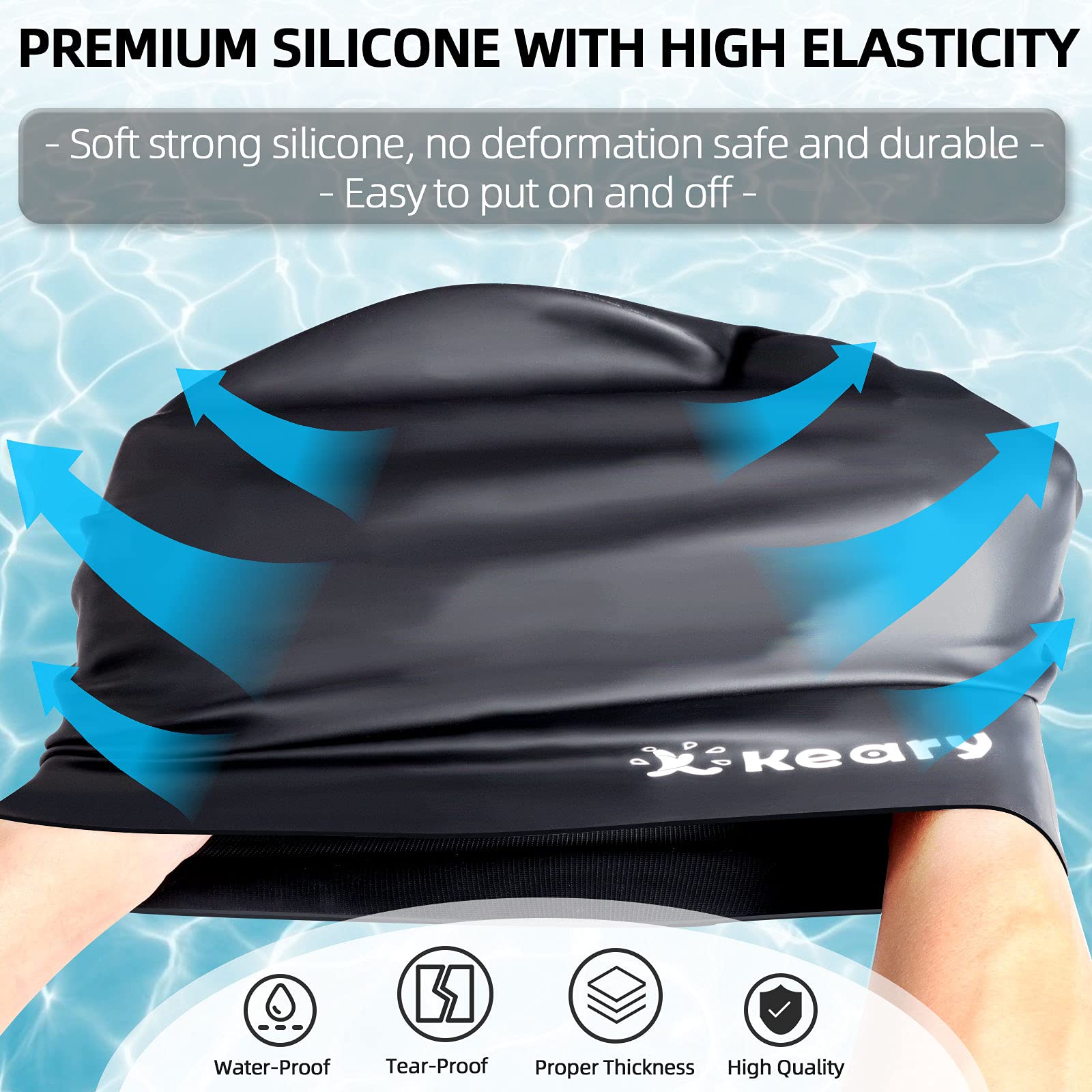 - SPACIOUS DESIGNED FOR DREADS & BRAIDSDesigned with great elasticity and extra larger room, Keary adult & youth unisex silicone swim cap for swimmiers has enough room to fit large head and any bulky hairstyle: Curly Hair, Extra Long Hair, Braids, Dreadlocks, Crochet Mambo, Extensions, Weave on, Afro hair. It keeps your hair lock secure and tangle-free when swimming and can be used as a shower cap!