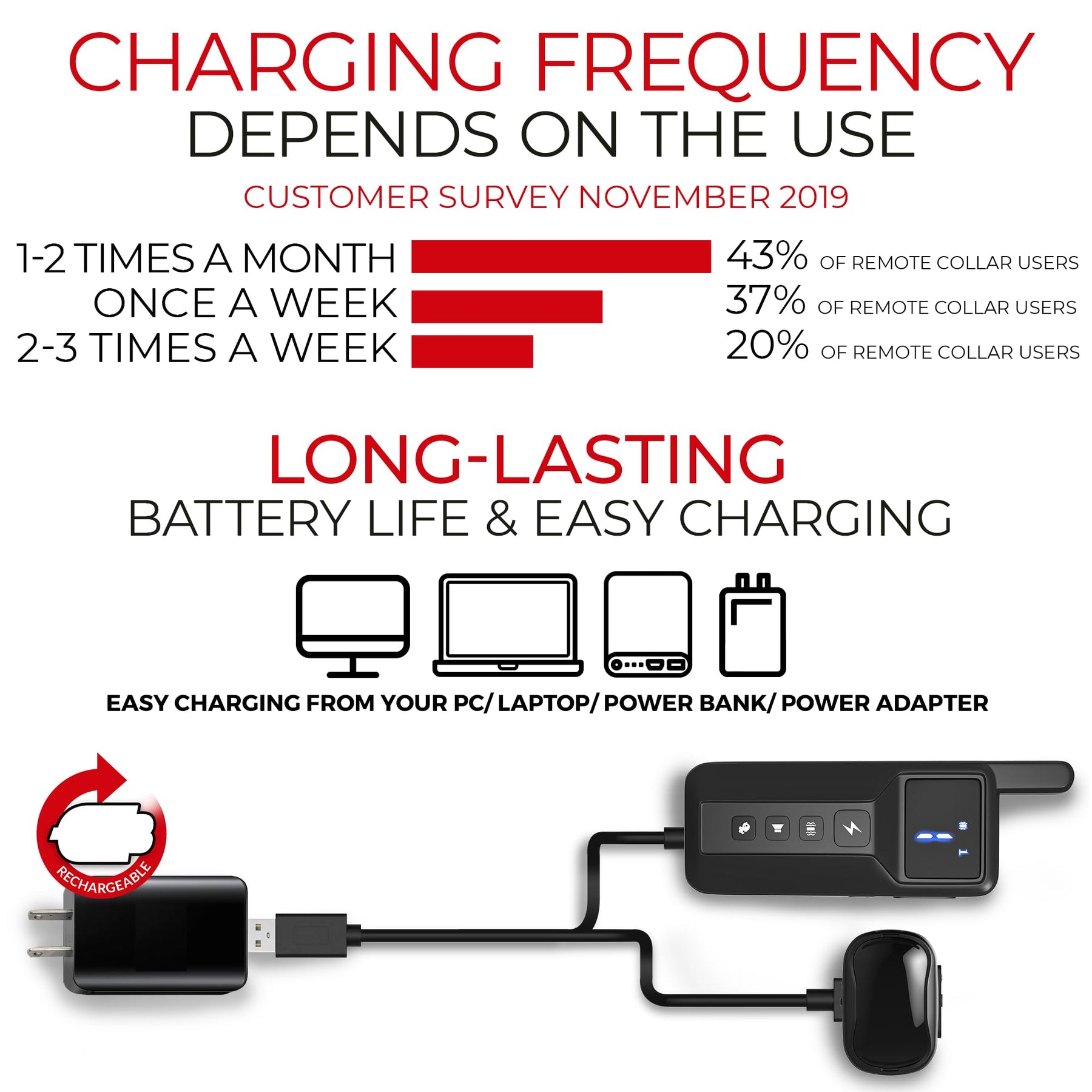 - Only Need To Charge Once Per Week - Long lasting lithium ion battery means with normal use, you only need to charge the collar once a week. Plus the remote fits easily in your pocket so you can take it with you. Comes with battery saving standby mode