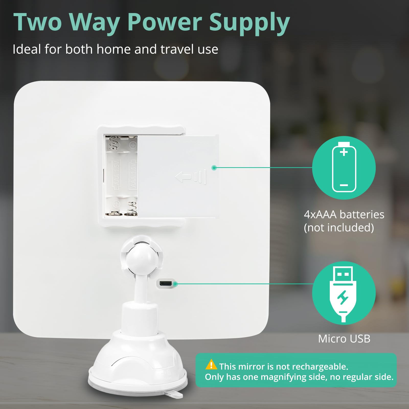 - DUAL POWER SUPPLY - For your convenience, Fabuday magnifying mirror with light is powered by 4xAAA batteries (not included) or USB cable. You can fix it in your bathroom with USB cable or light it up by batteries when travelling