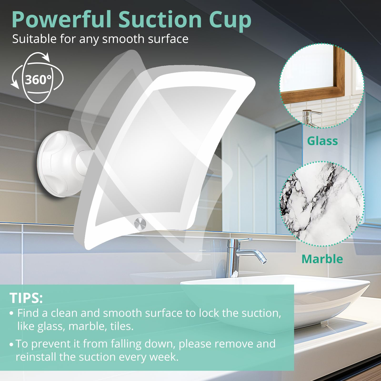 - POWERFUL SUCTION CUP - Through market research, we upgraded the suction cup of the magnified mirror to make it locked on the wall much more powerful and stable, no dropping anymore. Meanwhile it's portable and easy to lock on and take off so you can move it around. Tips: 1. The suction cup should be attached to a clean and smooth surface where will not be directly wetted. 2. Lock the suction by rotating the base clockwise until you can't twist it anymore