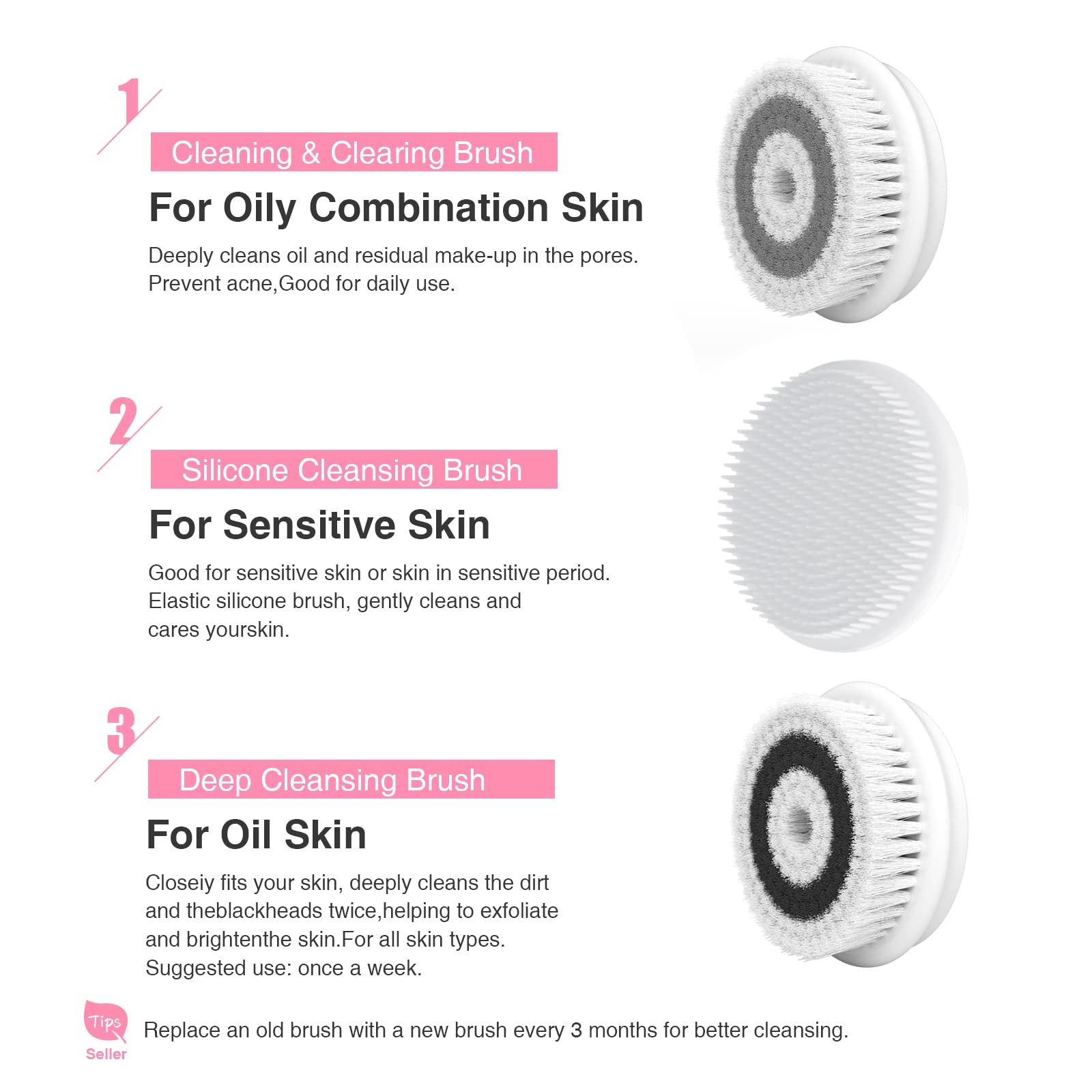 - 3 brush heads and 2-speed settingsThe electric facial cleansing instrument has 3 brush heads.0.055mm soft fiber brush can effectively remove oily dirt, facial cuticles,suitable for all skin types;0.075mm brush head with deep cleaning for oily skin;silicone brush head is food grade,no any hurting for skin,it's gentle and soothing,suitable for sensitive skin.There are 2 adjustable speed for the facial cleansing brush, low speed for gentle cleaning and high speed for deep cleaning.