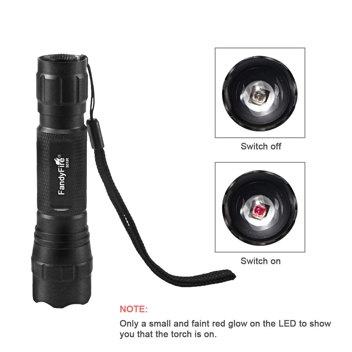 - INVISIBLE IR LIGHT --- FandyFire 501IR flashlight is not for General Lighting Purpose, it emits high power invisible 940NM infrared light, IR can't be seen by human eyes, recommend to use night vision monocular and goggles together.(only a small, faint red glow on the LED that shows you that the torch is on)