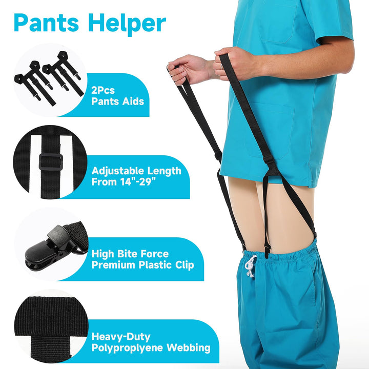 - Pants Assistant: Each pants tool comes with a clip-and-pull dressing aid strap. Adjustable from 26 to 41. Instructions: Step 1 : Attach the clip to your pants. Step 2 : Put your feet into the pants. Step 3 : Pull up the pants to avoid bending over and you can easily put on the pants with one hand. Application: Perfect for pulling up underwear, pants, boxers or skirts.