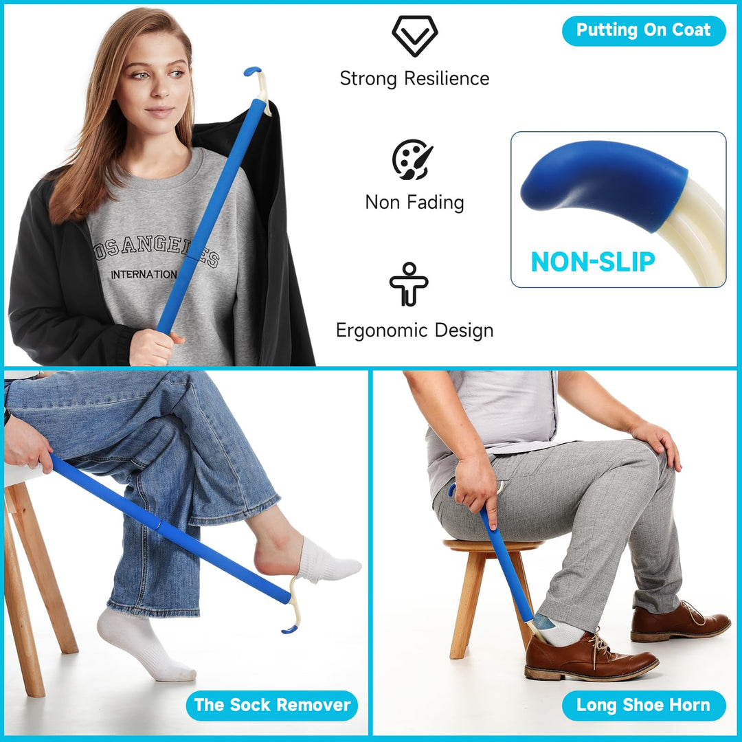 - Independent Dressing Stick: The dressing stick is a handy 2-in-1 tool for assisting with dressing and shoeing. 2 side S-hooks help put on and take off socks and grab hangers. Shoe horns help you put on shoes easily and the extra long 24 long foam handle helps reduce stretching and bending.