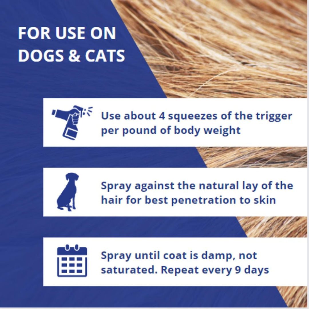 | directions | Cover animal's eyes with a hand and with a firm, fast stroke to get a proper spray mist, spray head, ears, and chest until damp. With fingertips, rub into the face around the mouth, nose, and eyes. Then spray neck, middle, and hindquarters, finishing legs last. For best penetration of spray to the skin, direct spray against the natural lay of the hair. On long-haired dogs, rub your hand against the lay of the hair, spraying the ruffled hair directly behind your hand. Make sure spray thoroughly wets ticks. Repeat every 9 days. Note that the recommended dose is about 4 squeezes of the trigger sprayer (0.13 fl oz) per pound of body weight. Short-haired dogs/puppies will need less; more spray may be needed for long-haired dogs/puppies. In all cases, apply spray until the coat is damp, not saturated. *Do not apply to animals less than 12 weeks old. |