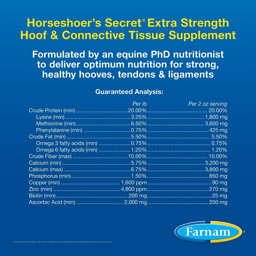 - Original Skin, Coat & Hoof Supplements – Horseshoer's Secret Extra Strength Hoof Supplements & Connective Tissue Supplement, Promotes Strong, Healthy Hooves, Tendon & ligaments, 7.5 lbs, 60 Day Supply by Farnam