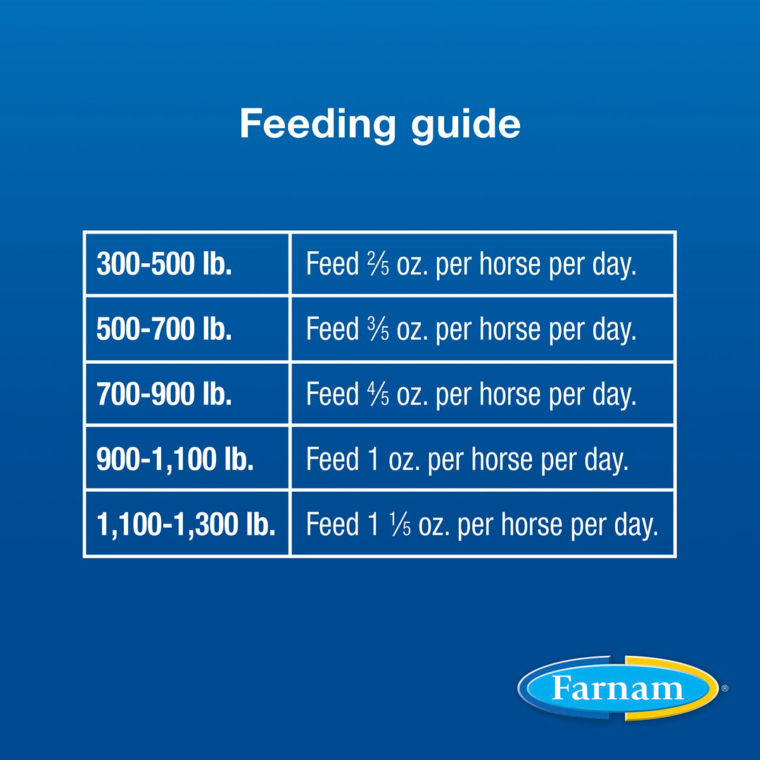 | directions | DO NOT USE ON HORSES INTENDED FOR SLAUGHTER Feed the recommended dosage of Farnam® SimpliFly® Feed-Thru Fly Control to each horse separately to make certain he receives his full portion. This product should be fed top dressed on grain or mixed with the horse's total ration to provide 6.8 mg of diflubenzuron per 100 lbs. of body weight. For an occasional finicky eater who does not accept new feeds readily, mix this product with sweet feed or grain ration. Start feeding Farnam® SimpliFly® Feed-Thru Fly Control early in the spring before flies begin to appear and continue feeding throughout the summer and into the fall until cold weather restricts fly activity. This product contains an insect growth regulator which prevents the development of house flies and stable flies in the manure of treated horses but is not effective against existing adult flies. In some cases, supplemental fly control measures may be needed in and around paddocks and buildings to control adult house and stable flies which can breed in other decaying vegetable matter or silage on-premises, or that migrate in from other areas. Farnam® SimpliFly® Feed-Thru Fly Control should be used as part of an integrated pest management program aimed at reducing fly populations in the horse's environment. Consult your retailer for program recommendations. In order to achieve optimum fly control, this product should be used in conjunction with other premise and on-animal products as well as good management and sanitation practices.. Do not contaminate water, food or feed by storage or disposal. PESTICIDE STORAGE: Store in original container in a cool dry place inaccessible to children and pets. PESTICIDE DISPOSAL: Wastes resulting from the use of this product may be disposed of on site or at an approved waste disposal facility. CONTAINER HANDLING: Nonrefillable container. Do not muse or refill This container. Completely empty plastic bucket by shaking and tapping sides and bottom to loosen clinging particles. Then offer for recycling if available or dispose of in a sanitary landfill or by incineration or if allowed by state and local authorities by burning. If burned, stay out of smoke.. DO NOT USE ON HORSES INTENDED FOR SLAUGHTER Feed the recommended dosage of Farnam® SimpliFly® Feed-Thru Fly Control to each horse separately to make certain he receives his full portion. This product should be fed top dressed on grain or mixed with the horse's total ration to provide 6.8 mg of diflubenzuron per 100 lbs. of body weight. For an occasional finicky eater who does not accept new feeds readily, mix this product with sweet feed or grain ration. Start feeding Farnam® SimpliFly® Feed-Thru Fly Control early in the spring before flies begin to appear and continue feeding throughout the summer and into the fall until cold weather restricts fly activity. This product contains an insect growth regulator which prevents the development of house flies and stable flies in the manure of treated horses, but is not effective against existing adult flies. See label for dosage by horse size. |