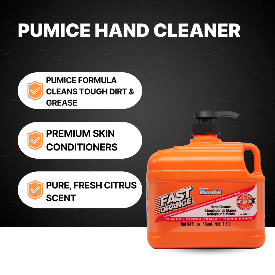 - Original Cleaners – Permatex 25217 Pumice Lotion, Heavy Duty Hand Cleaner, Natural Citrus Scent, Waterless Cleaner For Mechanics, Strong Grease Fighter, 1/2 Gallon, Orange, 64 Fl Oz (Pack of 1) by Fast Orange