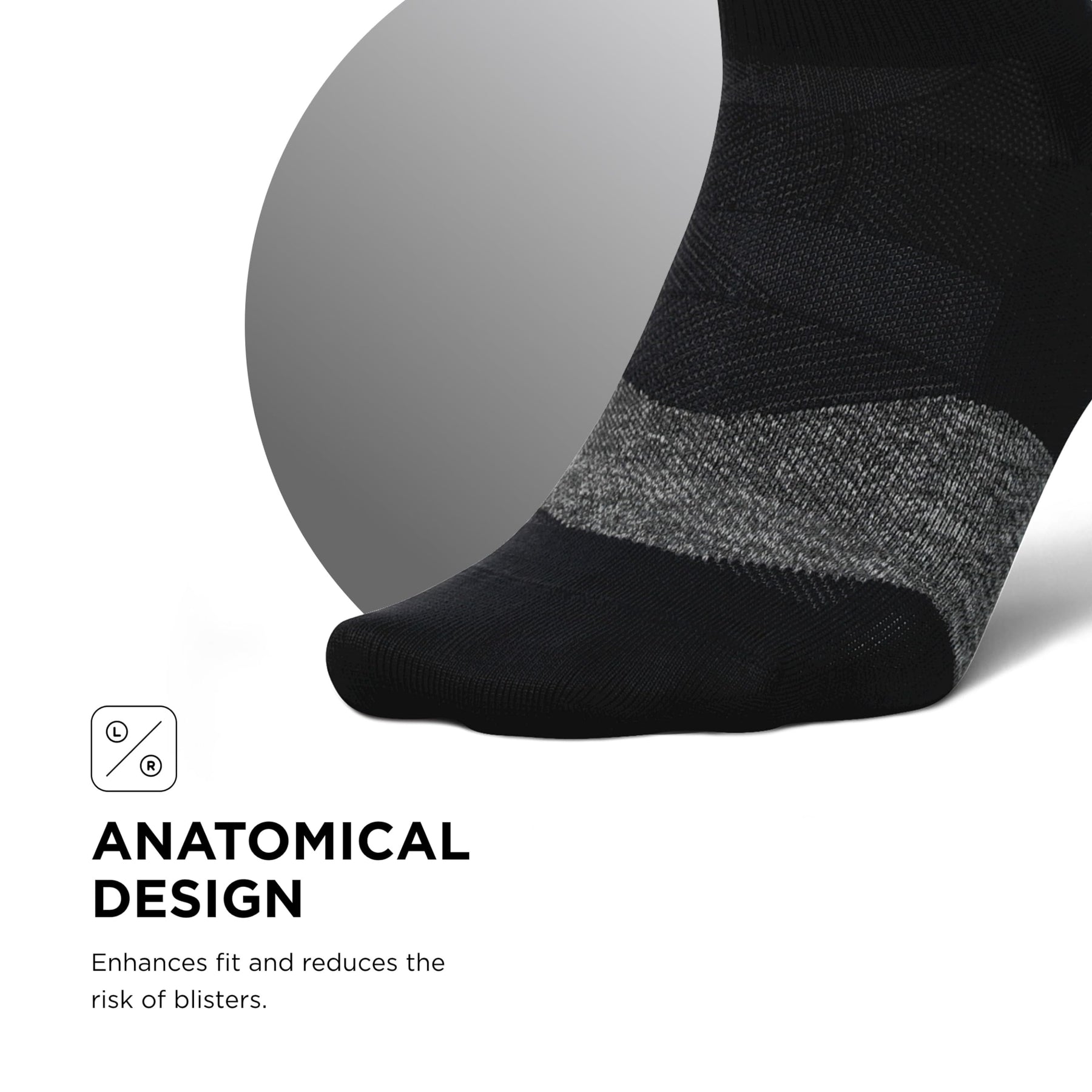 - Athletic Socks: These Feetures socks are engineered with Targeted Compression and anatomical design that conform to the left and right structure of the foot providing a custom-like fit and reduced risk of blisters because of the seamless toe construction
