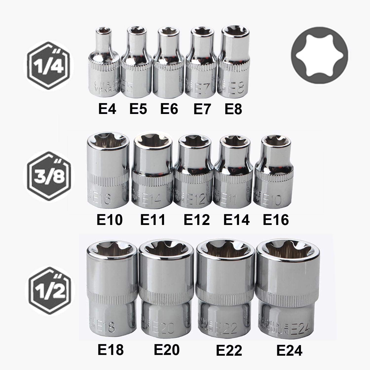 - Socket Sizes Includes: 1/4 Dr.: E4, E5, E6, E7, E8. 3/8 Dr.: E10, E11, E12, E14, E16. 1/2 Dr.: E18, E20, E22, E24.