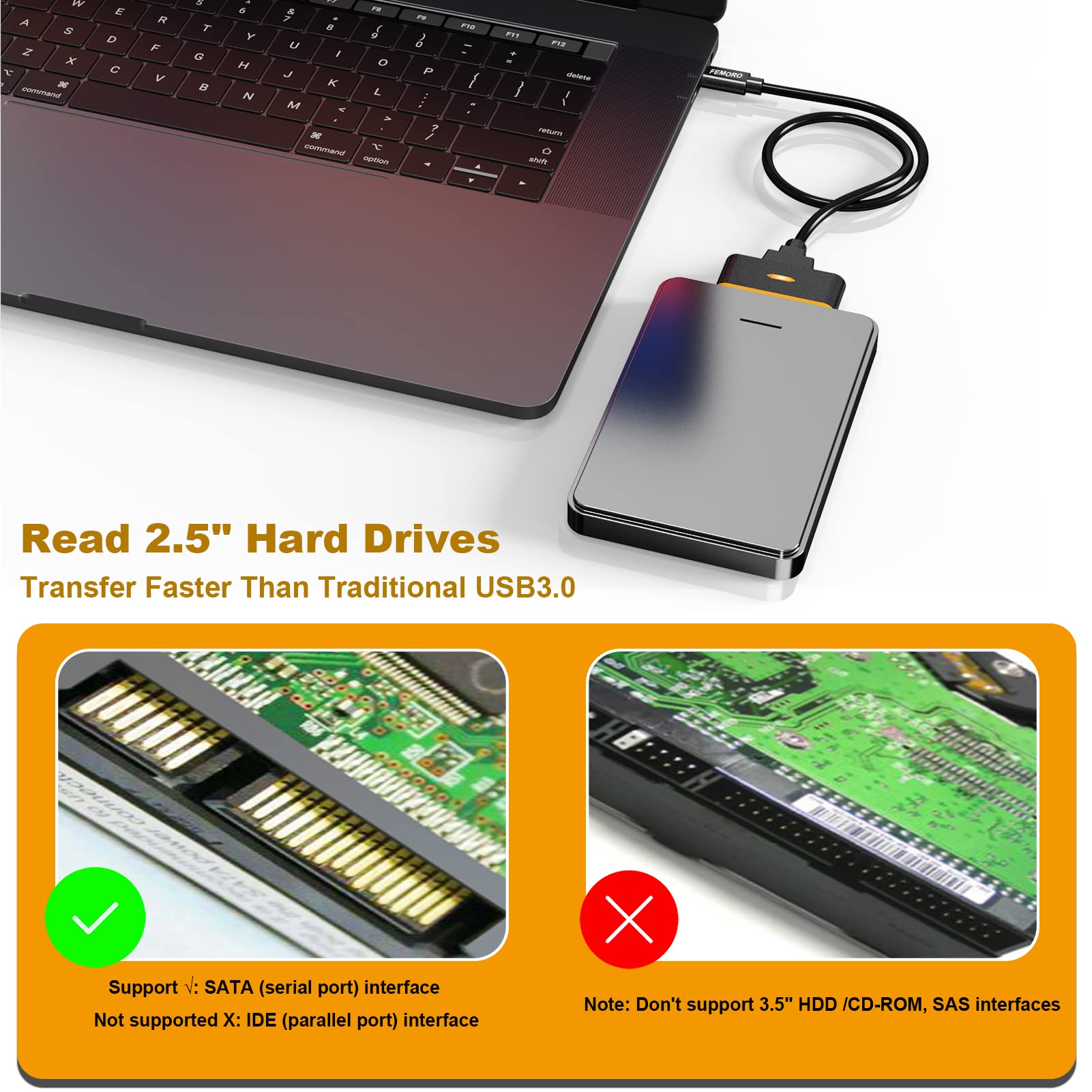 - ?Stable Data Transfer?FEMORO SATA to USB C Cable connects 2.5-inch sata ssd to your c-port laptop, and you can use an external drive: increase hard drive space, add storage, perform backups, upgrade the system, create disk images, implement spare hard drive data recovery for old devices and transfer content to laptops. note: the cable is for 2.5 sata drives only, 3.5/5.25 drives are not supported.