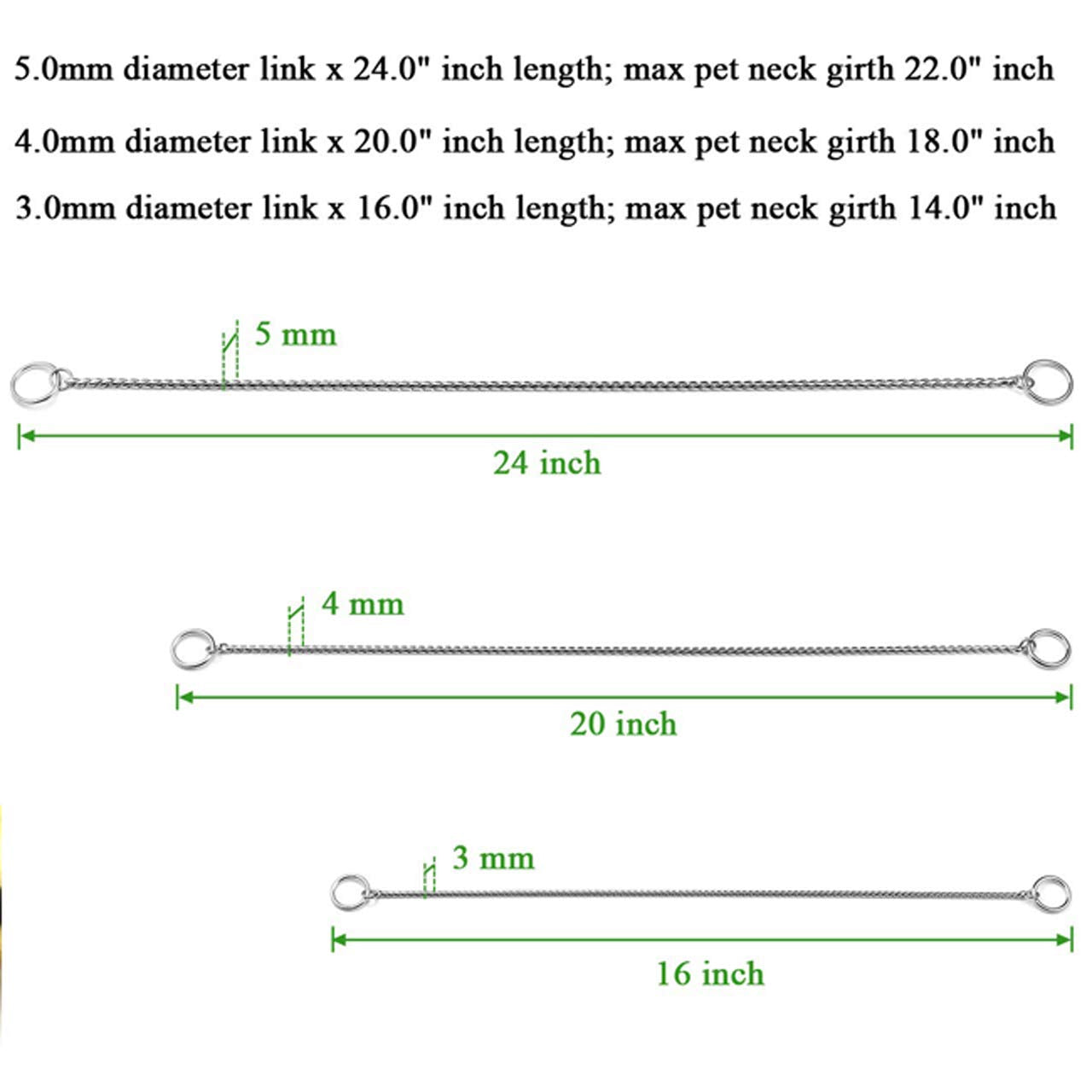 - SIZE: 3.0mm diameter link x 16.0 inch length. Please measure pet's neck and add at least 2-3 Inch for adjustment (16.0 length collar is applicable for max neck girth 14.0).