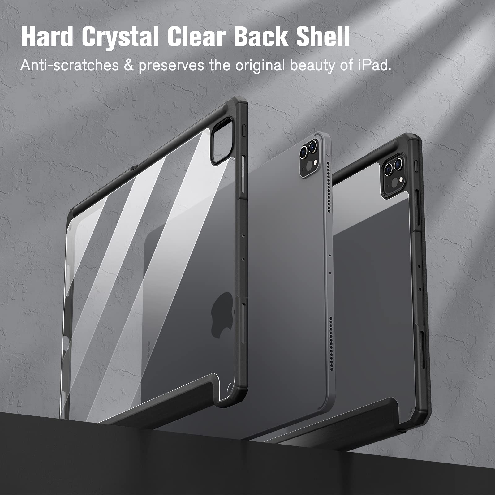 - Hardshell back cover with flexible TPU bumper protects your iPad from shocks, drops and impacts. Soft microfiber interior front prevents your tablet from scratched. And the crystal clear back cover will proudly show off the Apple icon.