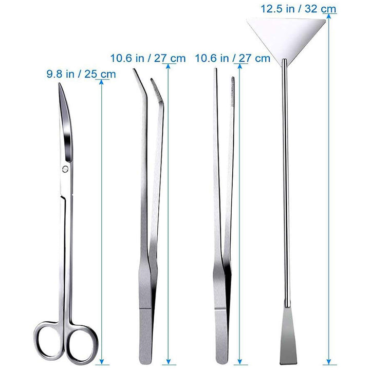 - 4 in 1 Aquascaping tools - 10.6'' Straight Tweezer, 10.6'' Curved Tweezer, 9.8'' Aquatic Curved Scissor, 12.5'' Sand spatula. one kit in a decent velvet pouch, for you to package well when not in use.
