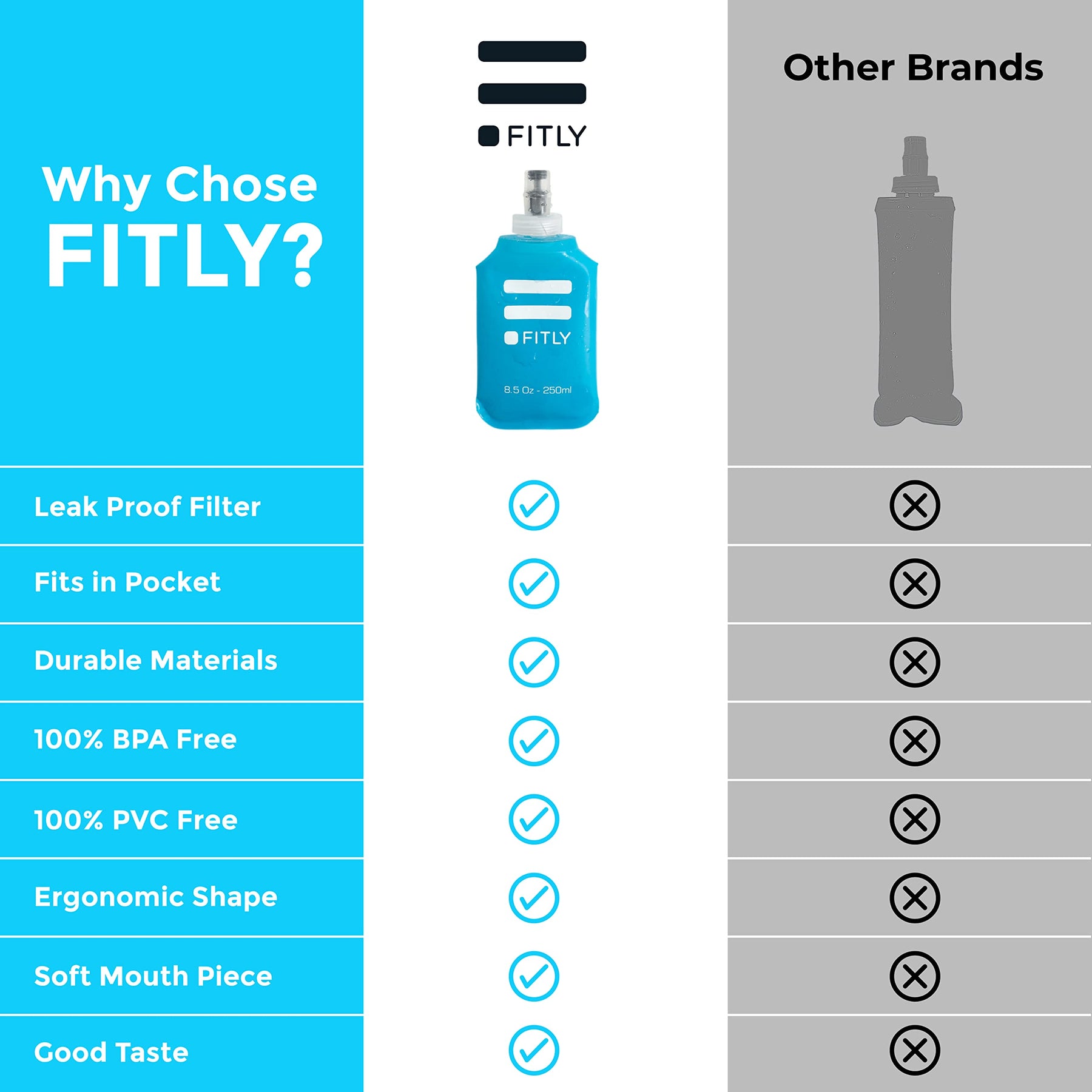 - STAY LIGHT ON YOUR FEET: FITLY’s collapsible flask is purposely lightweight ensuring your light on your feet and not weighted down by unnecessary bulk. At FITLY, reusability is deeply important to us, and our water bladder is no exception. Enjoy limitless use from our portable soft water bottle for running vest that is 100% BPA & PVC-free.