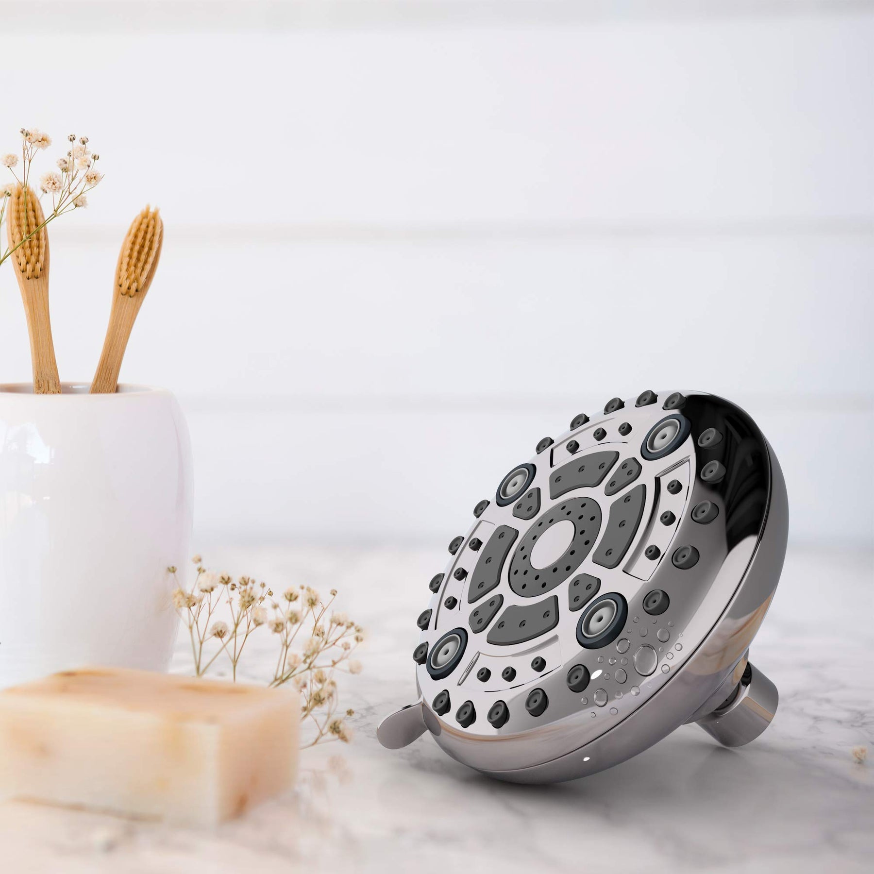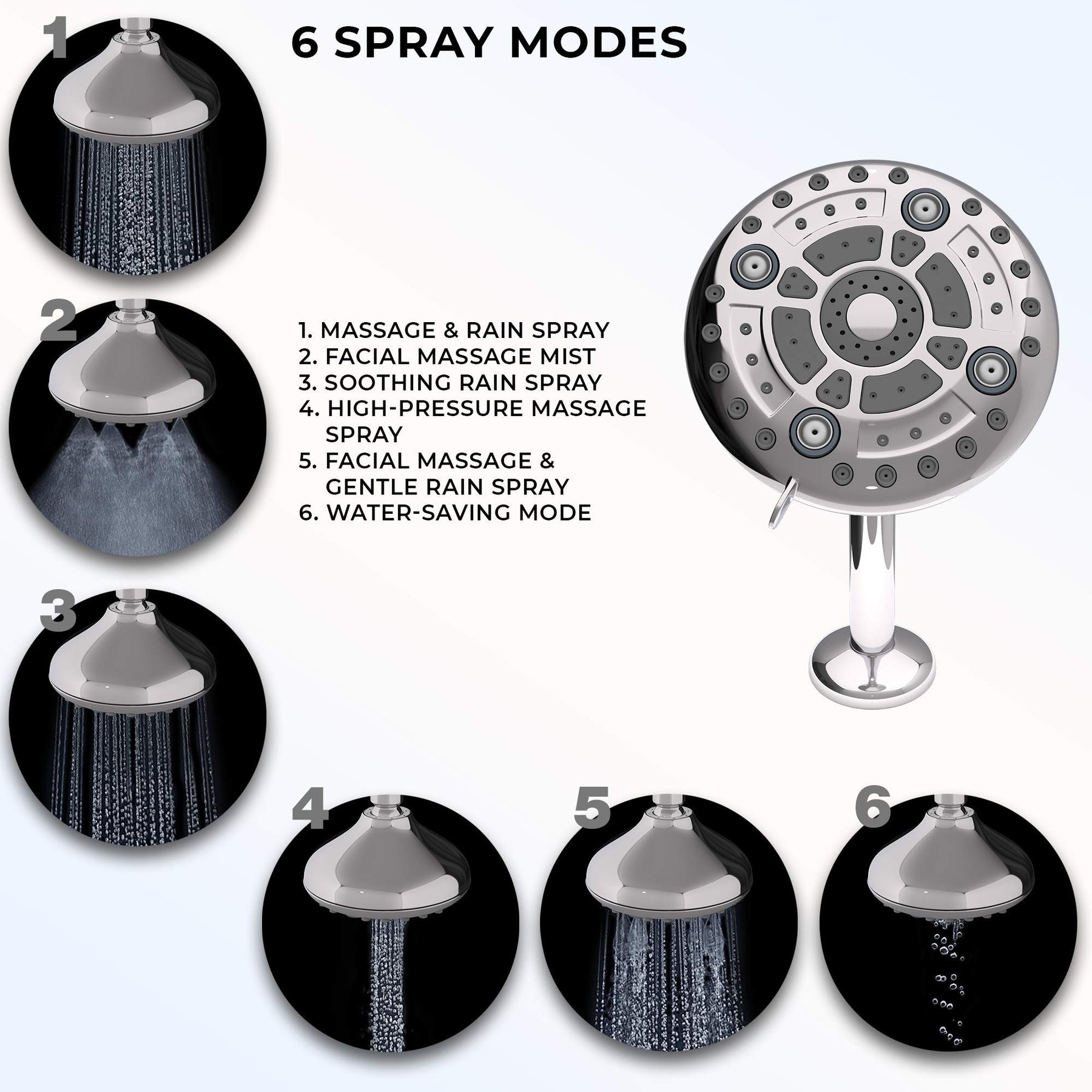 | special feature | Anti Clogging Silicone Nozzles | Pre-Installed Flow Restrictor | Fits Standard Shower Arm | 6 Spray Setting | |