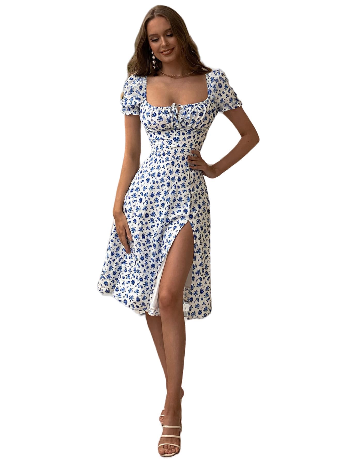 - Original Dresses – Women's Milkmaid Floral Print Puff Sleeve Square Neck Slit Hem Midi Dress Blue and White S by Floerns
