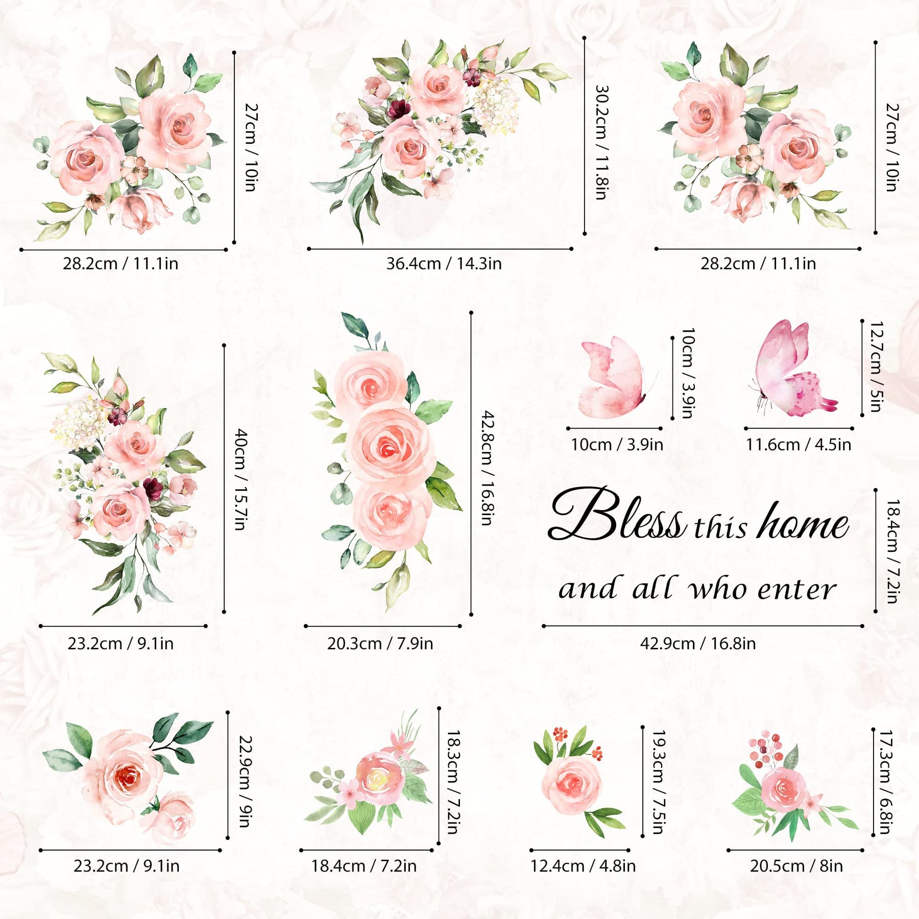- Abundant Quantity with 8 Sheets:You will get 8 sheets flower decals,sheet approx size is 11*14.7inch.Our floral wall decals nicely combine blooming peony, romantic roses leaves with bless this home and all who enterfamily quotes,designed to create romance for you.Ample quantity and various styles for you to create a blossoming garden and meet your different decorative needs.