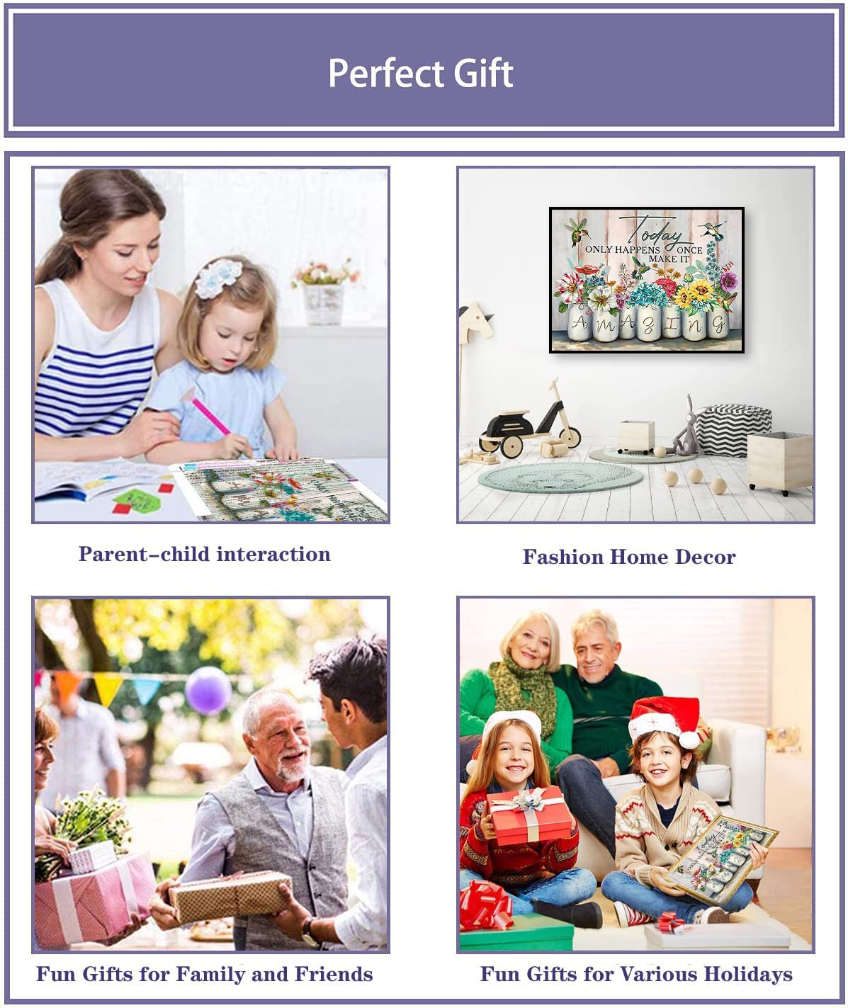 - Fun and Relaxation Finishing a Diamond Art Kits is a Process of Constantly adjust Yourself and Share Happy Time with Your Family or Friends. It will be Improved to an Educational Parent-Child Cooperation When you Complete this Diamond Painting Kits with your child. And Arts and Crafts for Adults Can help you drive away anxiety and calm your Mood Reduce Stress,Enhance Concentration, Increase self-Confidence, Develop Endurance, Etc.