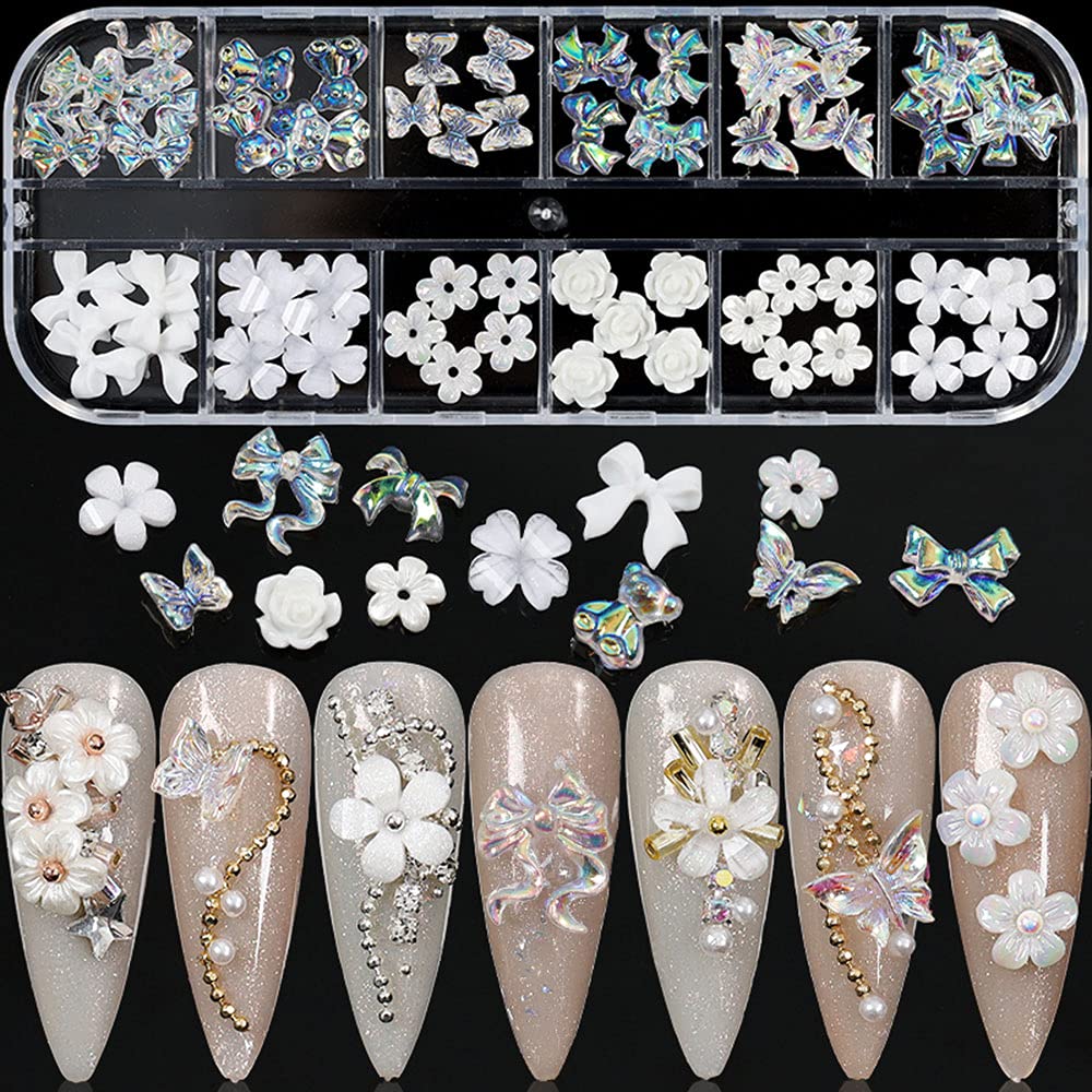 - Package Include: 1 Boxes white flower butterfly nail art charms, 12 pattern nail decoration glitter. Different fashionable pattern allowing you to have a shiny and attractive nail tip.