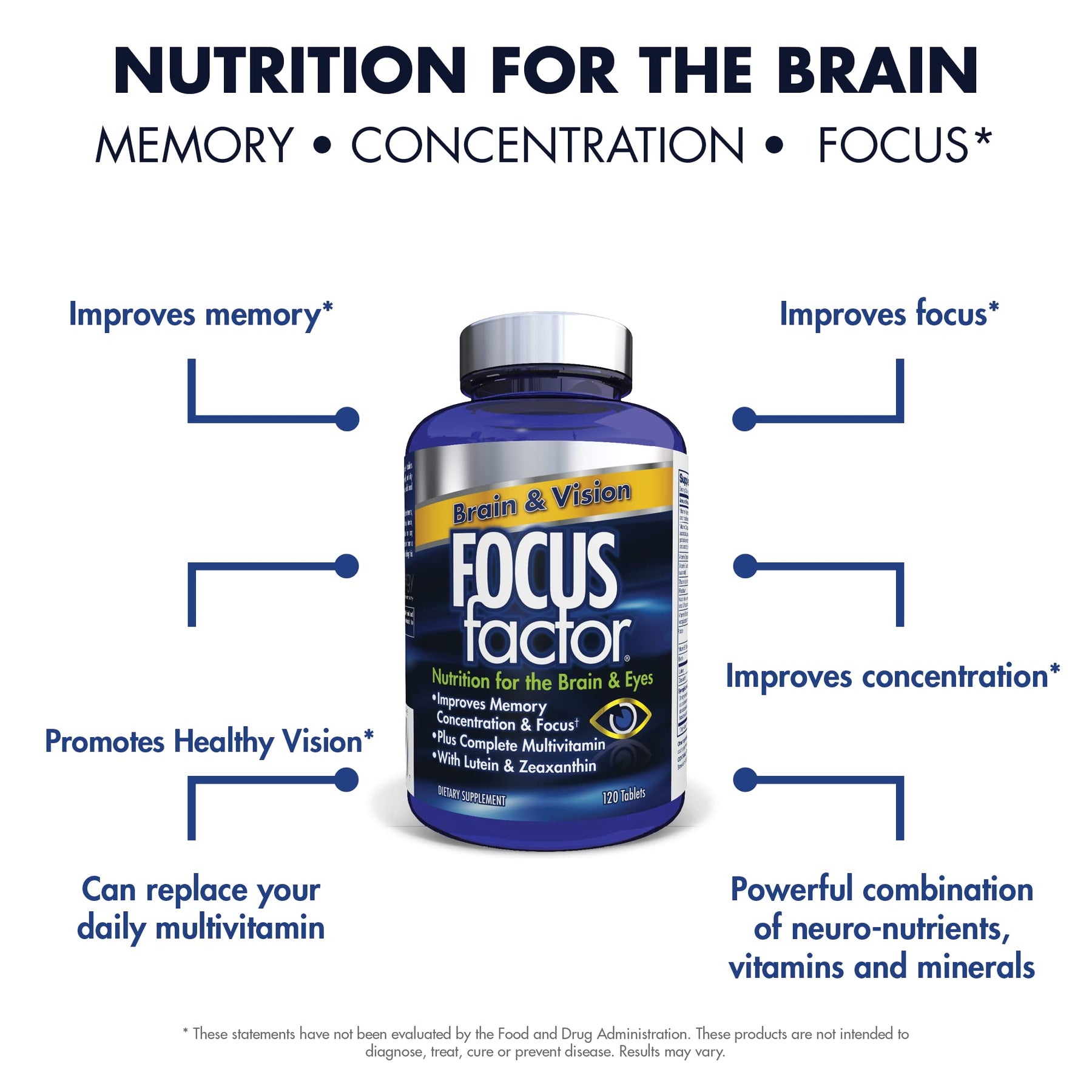 - ENHANCE FOCUS LEVELS: Like other parts of your body, your brain needs proper nutrition to perform at its best whether at work, home or on-the-go, and Focus Factor Brain and Vision supports healthy eyesight and improves memory and concentration.*