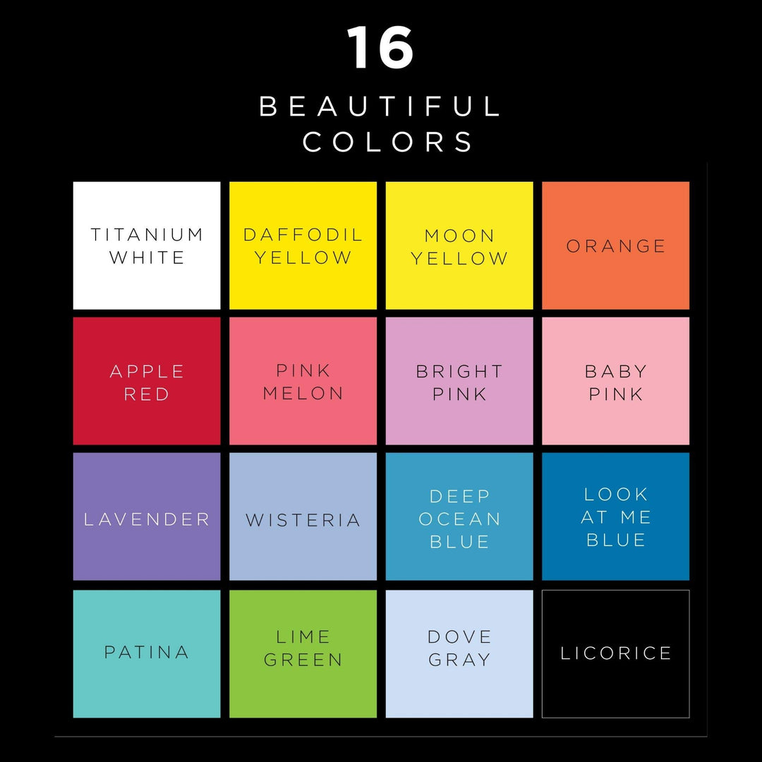 - VERSATILE PAINT KIT - This multi-surface acrylic paint set includes 16 - 2 oz bottles of acrylic craft paint. The colors in this set include: FolkArt Multi-Surface Lime Green, Pink Melon, Baby Pink, Bright Pink, Daffodil, Moon Yellow, Dove Gray, Titanium White, Pure Orange, Look At Me Blue, Lavender, Wisteria, Licorice, Patina, Deep Ocean Blue and Apple Red.