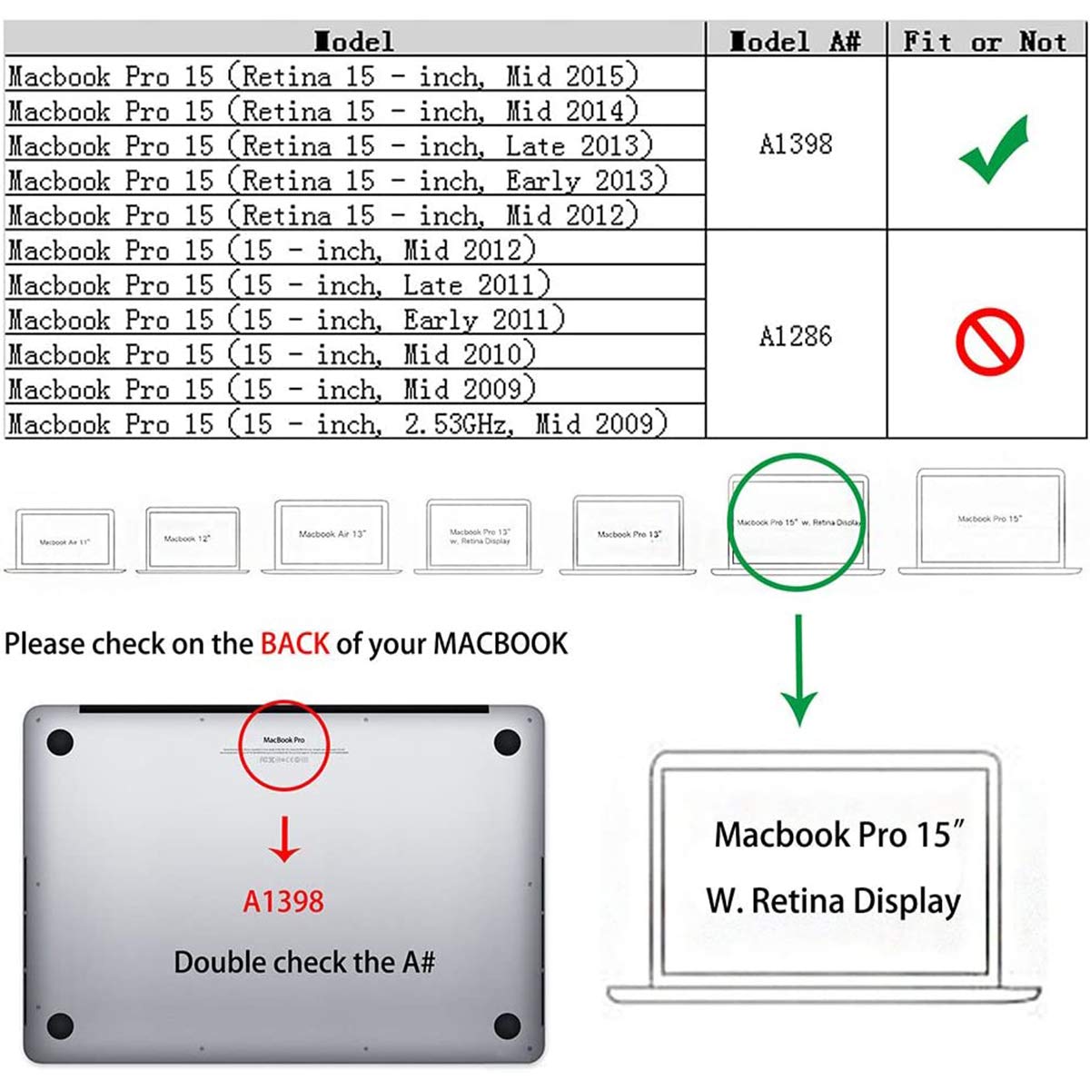 - Compatible with 2012 2013 2014 2015 Relelase for MacBook Pro 15 with Retina Display Model: A1398. Release 2015: MJLU2LL/A , MJLQ2LL/A , AMJLT2LL/A; Release 2014 and 2013: MGXA2LL/A, MGXC2LL/A, ME293LL/A, ME294LL/A; Release end 2012: MC975LL/A, MC976LL/A, ME664LL/A, ME665LL/A. - Please kindly check model number A1398on the back of the for MacBook before your purchase.