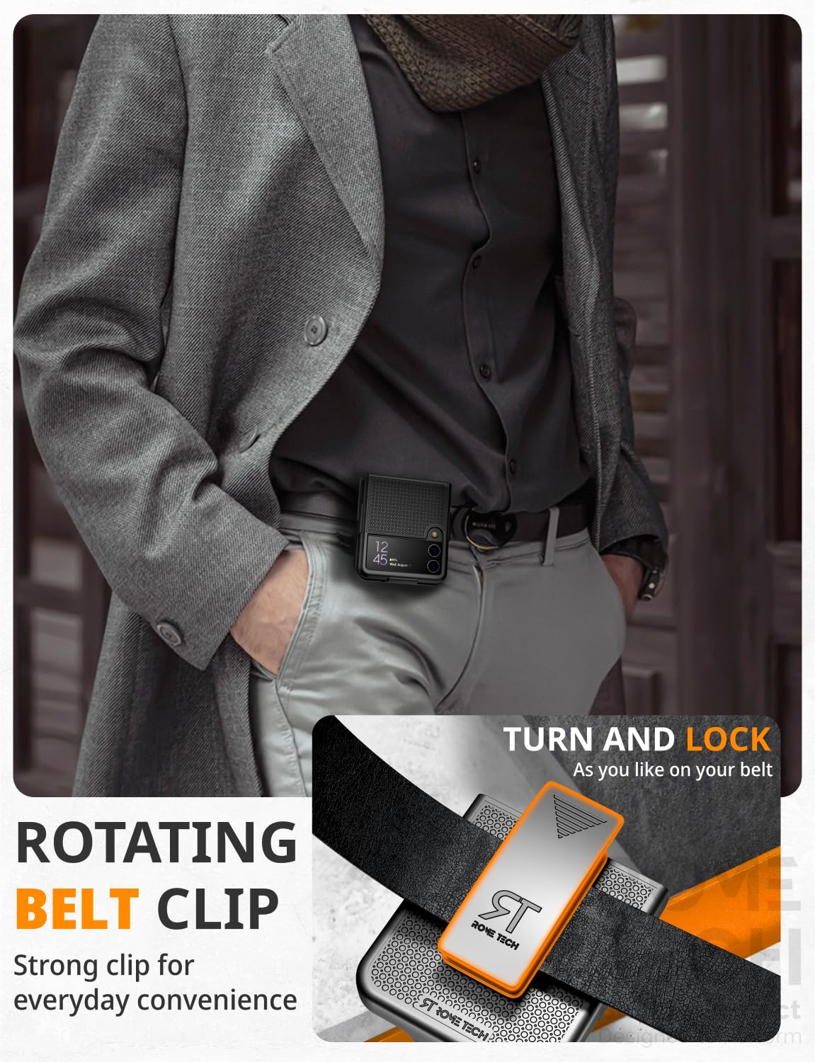 - Rotating Belt Clip: Equipped with a strong clip for everyday convenience, allowing simple [TURN/LOCK] in different positions - Secure and convenient fixation of your Galaxy Z Flip 3 on a belt